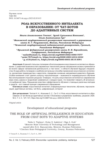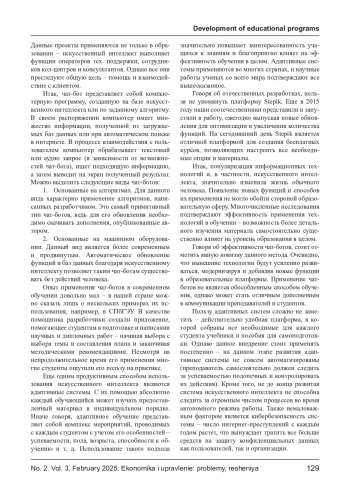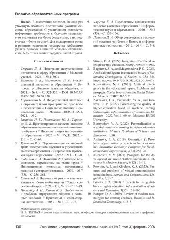 2. Баганова З. А., Магомедова П. О. Искусственный интеллект в образовании // Вопросы устойчивого развития общества. - 2021. - № 4. - С. 352-356. -. DOI: 10.34755/IROK.2021.30.50.078
