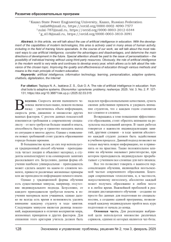 В данной статье мы поговорим об использовании искусственного интеллекта в образовании. С развитием возможностей современных технологий данное направление активно применяется во многих сферах человеческой деятельности, в том числе - в области обучения будущих специалистов. В ходе работы поговорим о наиболее актуальных способах применения искусственного интеллекта, рассмотрим преимущества и недостатки, определим основные направления развития в будущем. Особое внимание стоит уделить вопросу персонализации - возможности индивидуального обучения без использования сторонних ресурсов. Очевидно, что роль искусственного интеллекта в современном мире очень широка и продолжает развиваться с каждым годом, что позволяет говорить об актуальности выбранной темы. Повышение качества и эффективности обучения с помощью различных методов и средств - вот главный принцип современного образования.