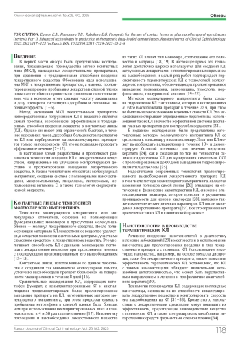 Обзор посвящен использованию современных технологий в производстве терапевтических контактных линз (КЛ), содержащих лекарственные препараты. В настоящее время разработаны и продолжают развиваться методы создания КЛ с лекарственным веществом, направленные на улучшение контролируемой доставки и пролонгирование выведения из них лекарственного вещества. К таким технологиям относятся: молекулярный импринтинг, создание систем с полимерными наночастицами, микроэмульсиями, мицеллами, липосомами, использование витамина Е, а также технология сверхкритической жидкости. Многочисленные работы в этой области показывают большие перспективы использования КЛ, содержащих лекарственный препарат, в терапии глазных заболеваний. С помощью таких КЛ в глаз доставляются антибиотики, нестероидные противовоспалительные средства, глюкокортикостероиды, антиглаукоматозные и противовирусные препараты, гиалуроновая кислота, атропин. При этом значительно (в десятки раз) увеличивается продолжительность пребывания лекарственного препарата в слезной пленке, а также высвобождения и постепенного поступления в глаз лекарственного вещества (до нескольких месяцев — как того требует лечение). Однако, несмотря на достижения современных технологий изготовления терапевтических КЛ с лекарственным препаратом, существует ряд проблем, связанных с представленными инновациями, — возникают изменения в характеристиках полимера КЛ: механических свойствах, влагосодержании, прозрачности, кислородопроницаемости. Эти изменения пока ограничивают применение лечебных линз, созданных по инновационным технологиям, в клинической практике, и требуется совершенствование как самого материала КЛ, так и технологий сохранения свойств лекарственного вещества в КЛ.