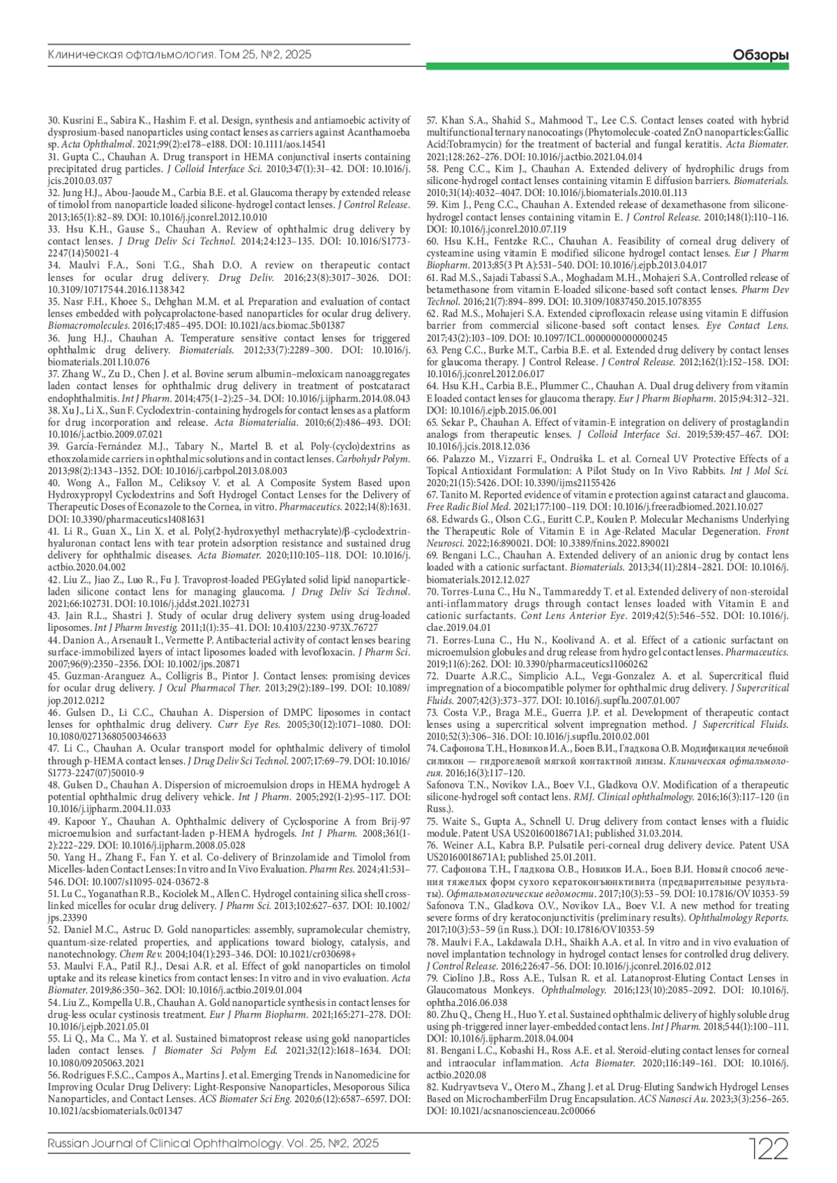 32. Jung H.J., Abou-Jaoude M., Carbia B.E. et al. Glaucoma therapy by extended release of timolol from nanoparticle loaded silicone-hydrogel contact lenses. J Control Release. 2013;165(1):82-89. DOI: 10.1016/j.jconrel.2012.10.010