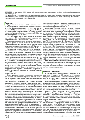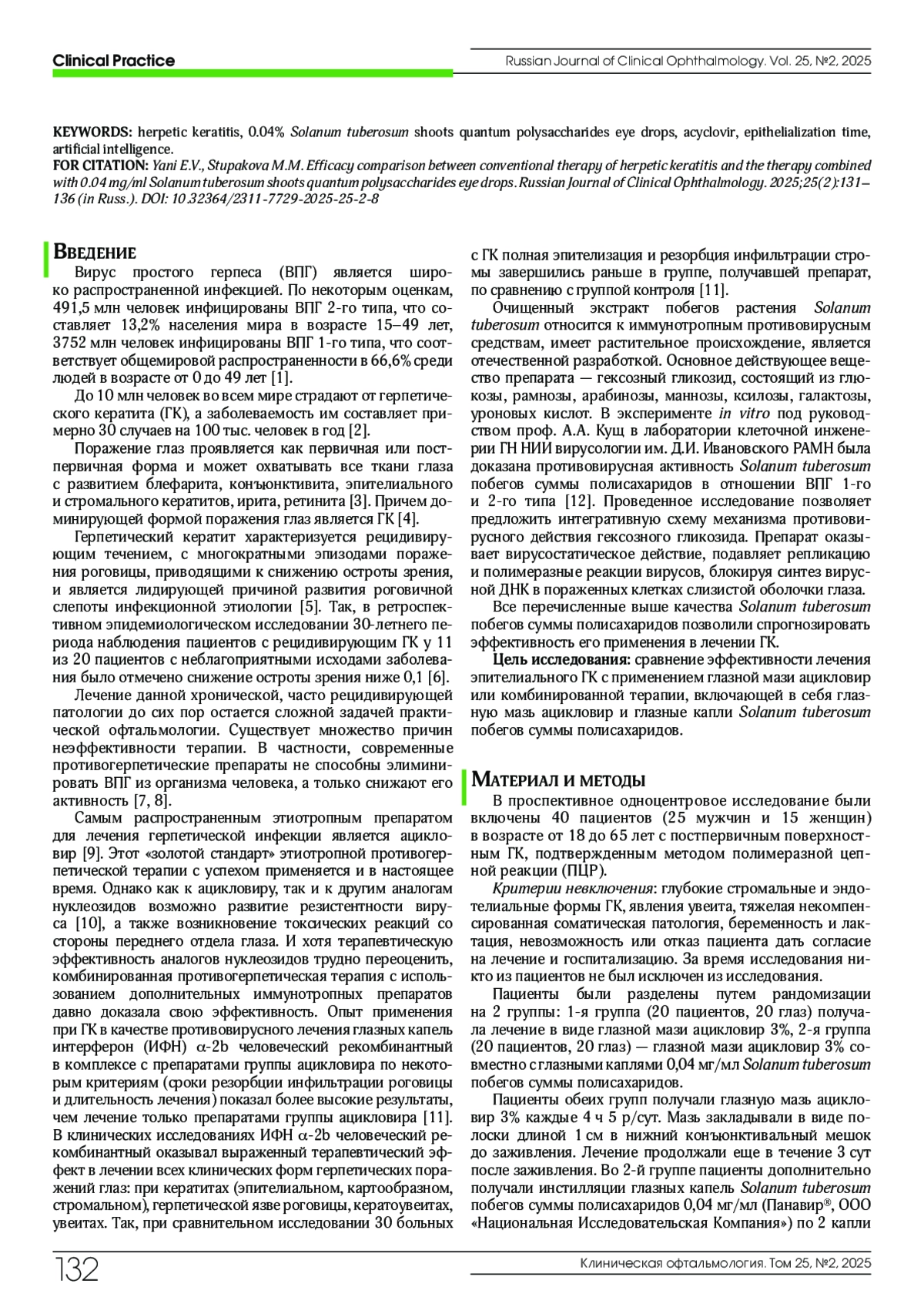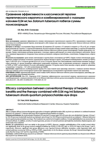 Цель исследования: сравнение эффективности лечения эпителиального герпетического кератита (ГК) с применением глазной мази ацикловир или комбинированной терапии, включающей в себя глазную мазь ацикловир и глазные капли Solanum tuberosum побегов суммы полисахаридов.
