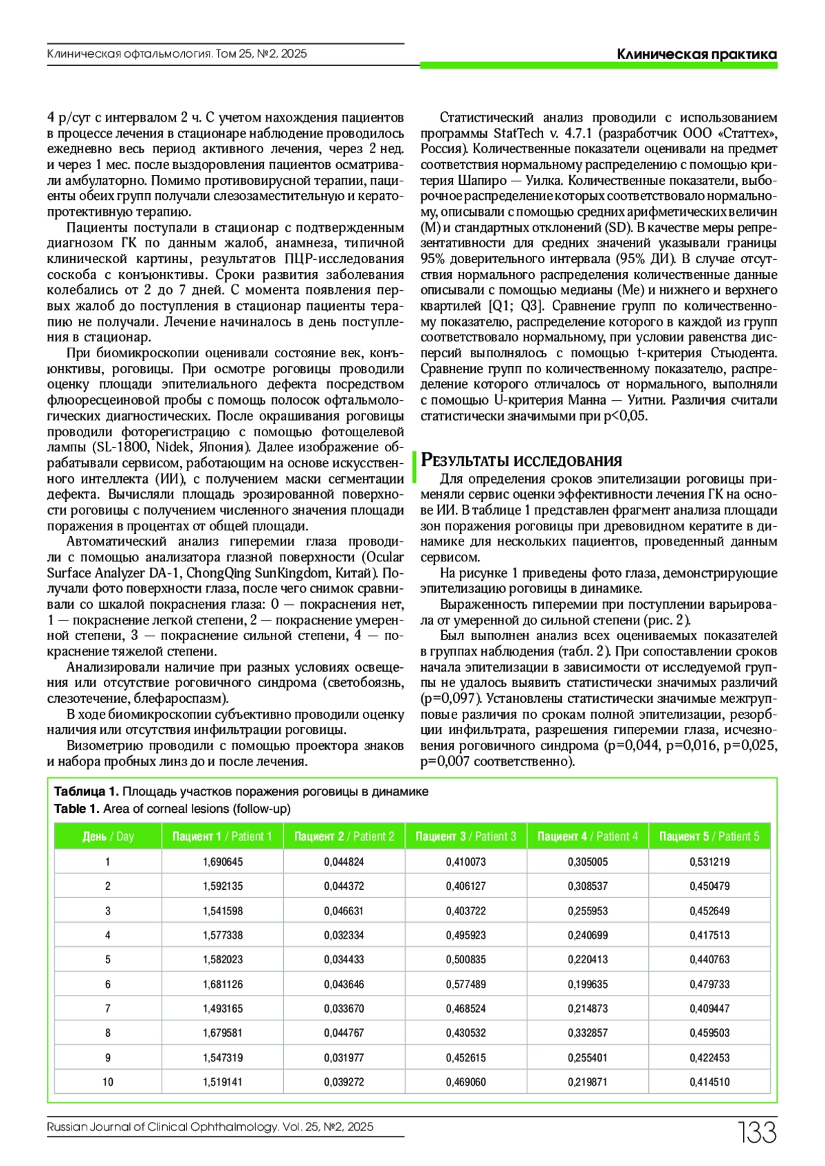 Материал и методы: в исследование были включены 40 пациентов (25 мужчин и 15 женщин) в возрасте от 18 до 65 лет, которые были разделены на 2 группы: 1-я группа (20 пациентов, 20 глаз) получала лечение глазной мазью ацикловир, 2-я группа (20 пациентов, 20 глаз) — глазной мазью ацикловир и глазными каплями Solanum tuberosum побегов суммы полисахаридов. Лечение проводили в стационаре. Оценку эпителизации роговицы проводили с помощью сервиса, работающего на основе искусственного интеллекта. Кроме того, оценивали выраженность гиперемии глаза, наличие роговичного синдрома (светобоязнь, слезотечение, блефароспазм), остроту зрения.