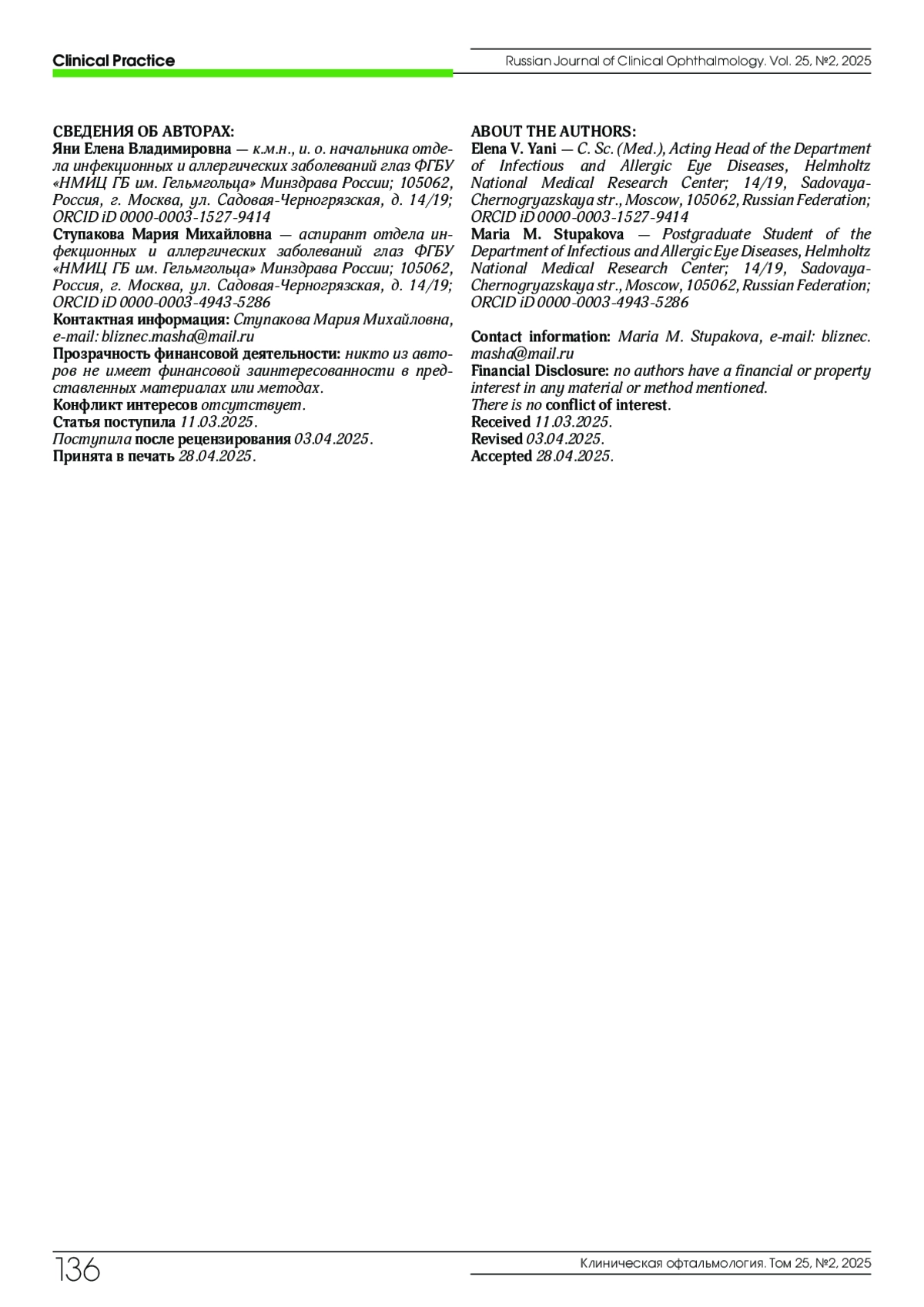 3. Valerio G.S., Lin C.C. Ocular manifestations of herpes simplex virus. Curr Opin Ophthalmol. 2019;30(6):525-531. DOI: 10.1097/ICU.0000000000000618