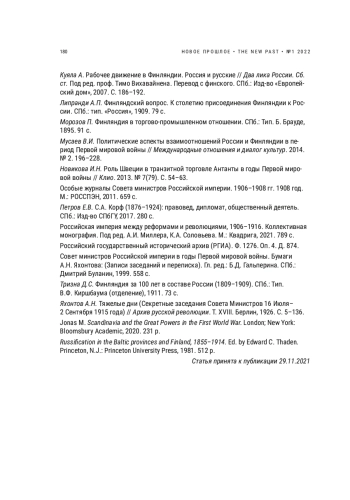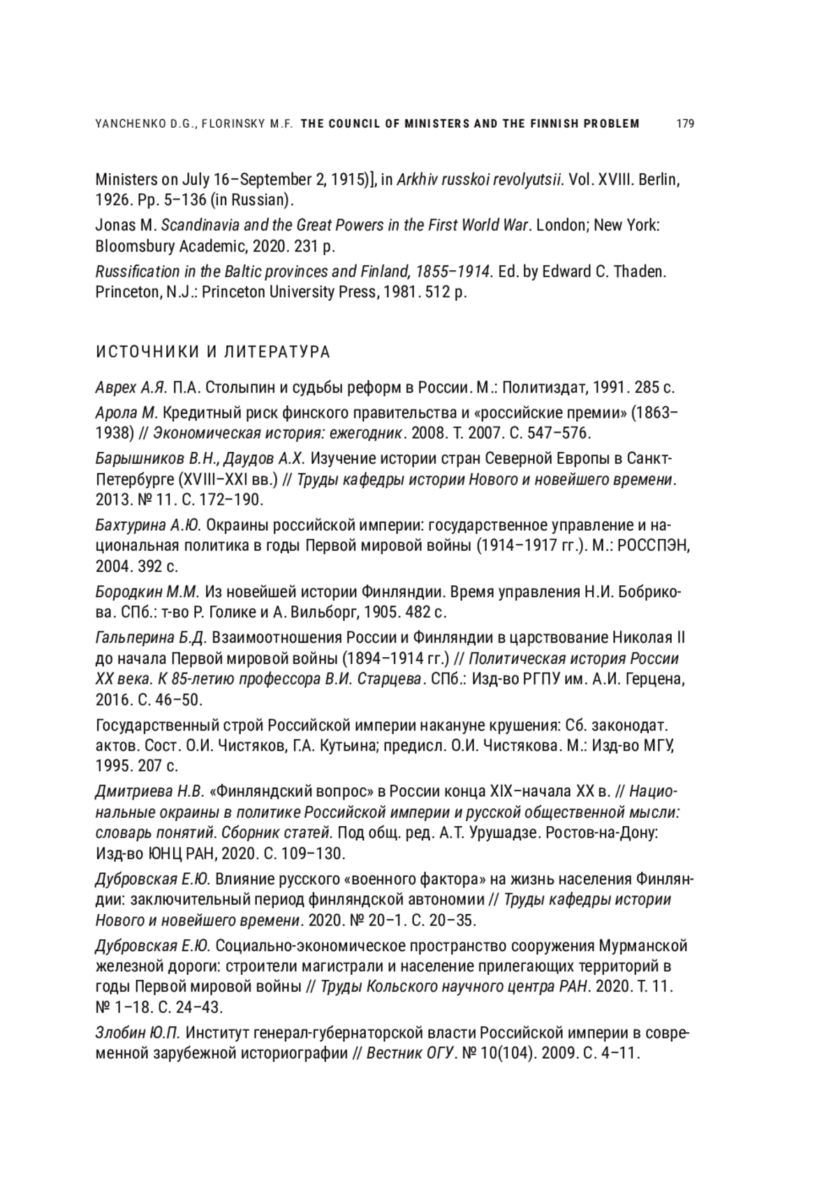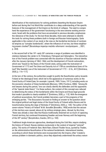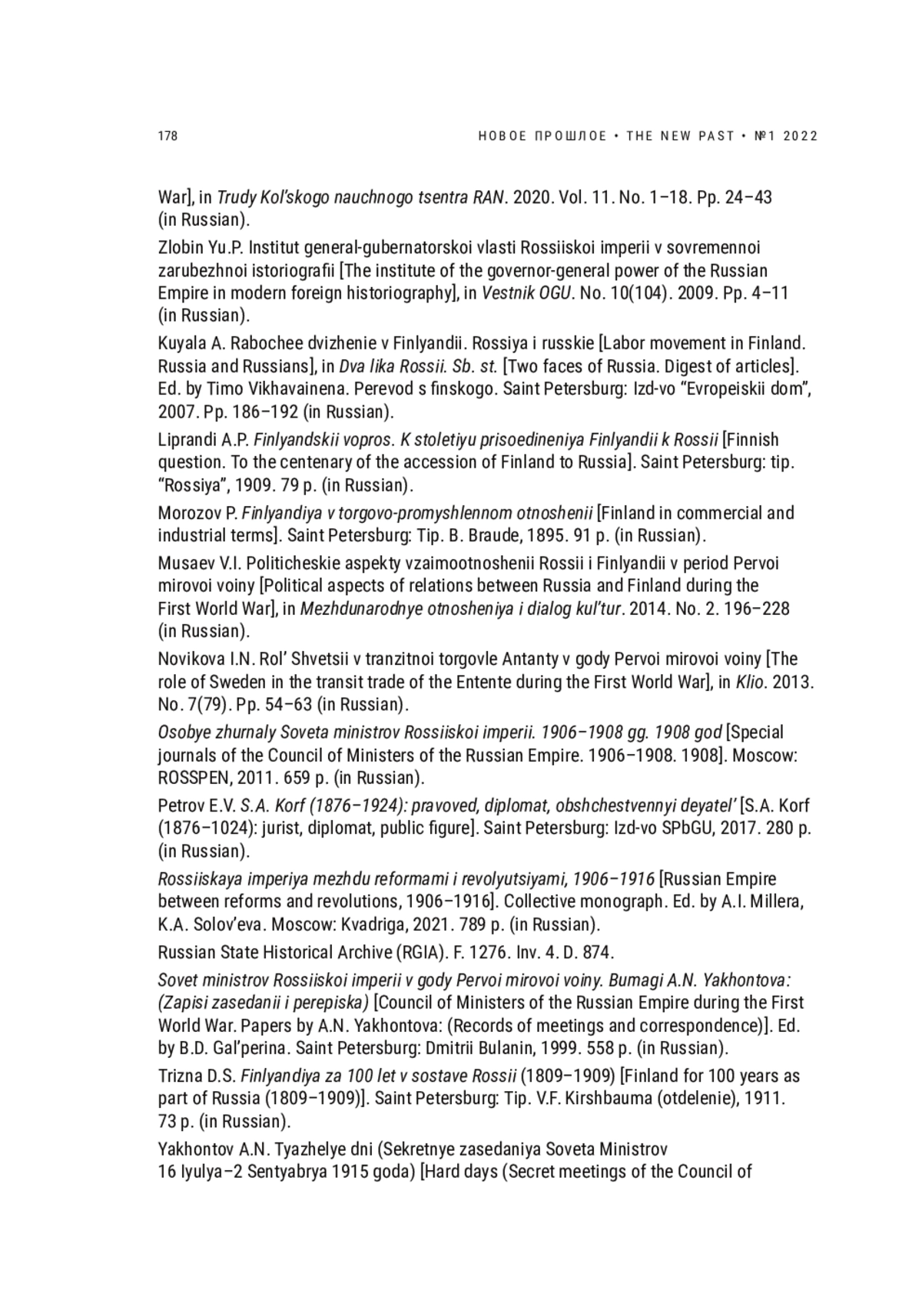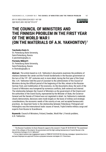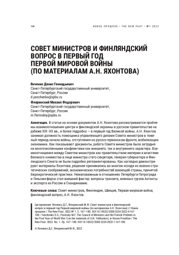 ЯНЧЕНКО Д. Г., ФЛОРИНСКИЙ М. Ф. THE COUNCIL OF MINISTERS AND THE FINNISH PROBLEM IN THE FIRST YEAR OF WORLD WAR I (ON THE MATERIALS OF A. N. YAKHONTOV) // НОВОЕ ПРОШЛОЕ. 2022. № 1