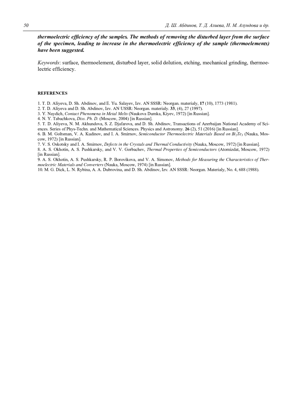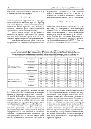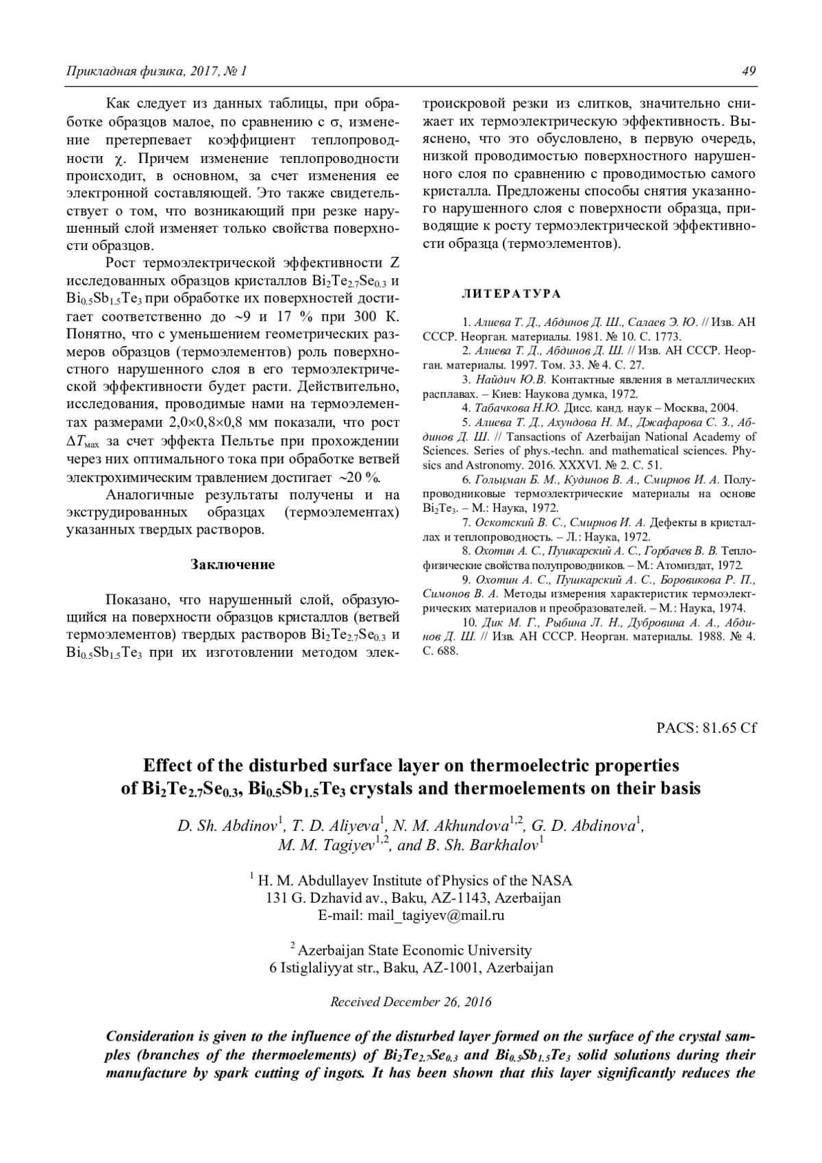 АБДИНОВ Д. Ш., АЛИЕВА Т. Д., АХУНДОВА Н. М., АБДИНОВА Г. Д., ТАГИЕВ М. М., БАРХАЛОВ Б. Ш. ВЛИЯНИЕ ПОВЕРХНОСТНОГО НАРУШЕННОГО СЛОЯ НА ТЕРМОЭЛЕКТРИЧЕСКИЕ СВОЙСТВА КРИСТАЛЛОВ BI2TE2.7SE0.3, BI0.5SB1.5TE3 И ТЕРМОЭЛЕМЕНТОВ НА ИХ ОСНОВЕ // ПРИКЛАДНАЯ ФИЗИКА. 2017. №1