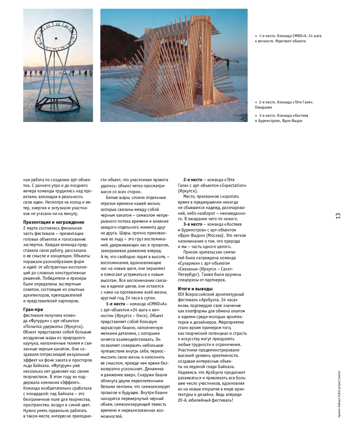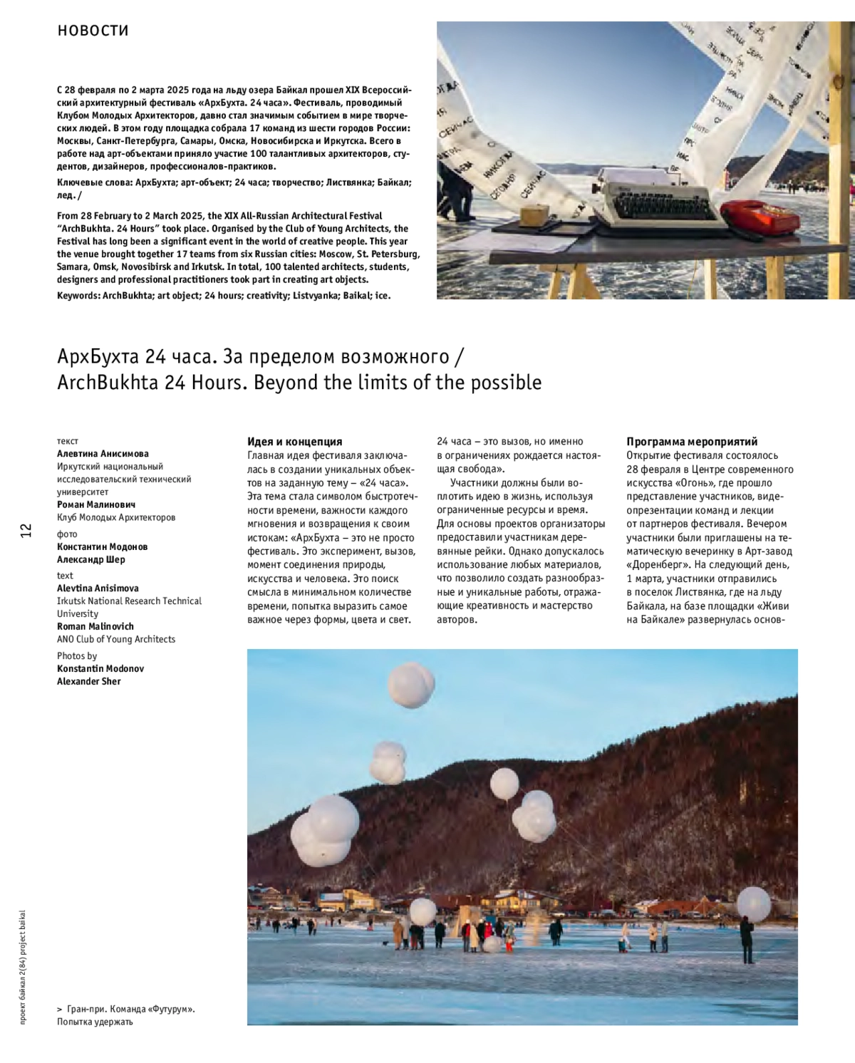 С 28 февраля по 2 марта 2025 года на льду озера Байкал прошел XIX Всероссийский архитектурный фестиваль «АрхБухта. 24 часа». Фестиваль, проводимый Клубом Молодых Архитекторов, давно стал значимым событием в мире творческих людей. В этом году площадка собрала 17 команд из шести городов России: Москвы, Санкт-Петербурга, Самары, Омска, Новосибирска и Иркутска. Всего в работе над арт-объектами приняло участие 100 талантливых архитекторов, студентов, дизайнеров, профессионалов-практиков.
