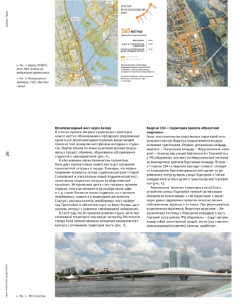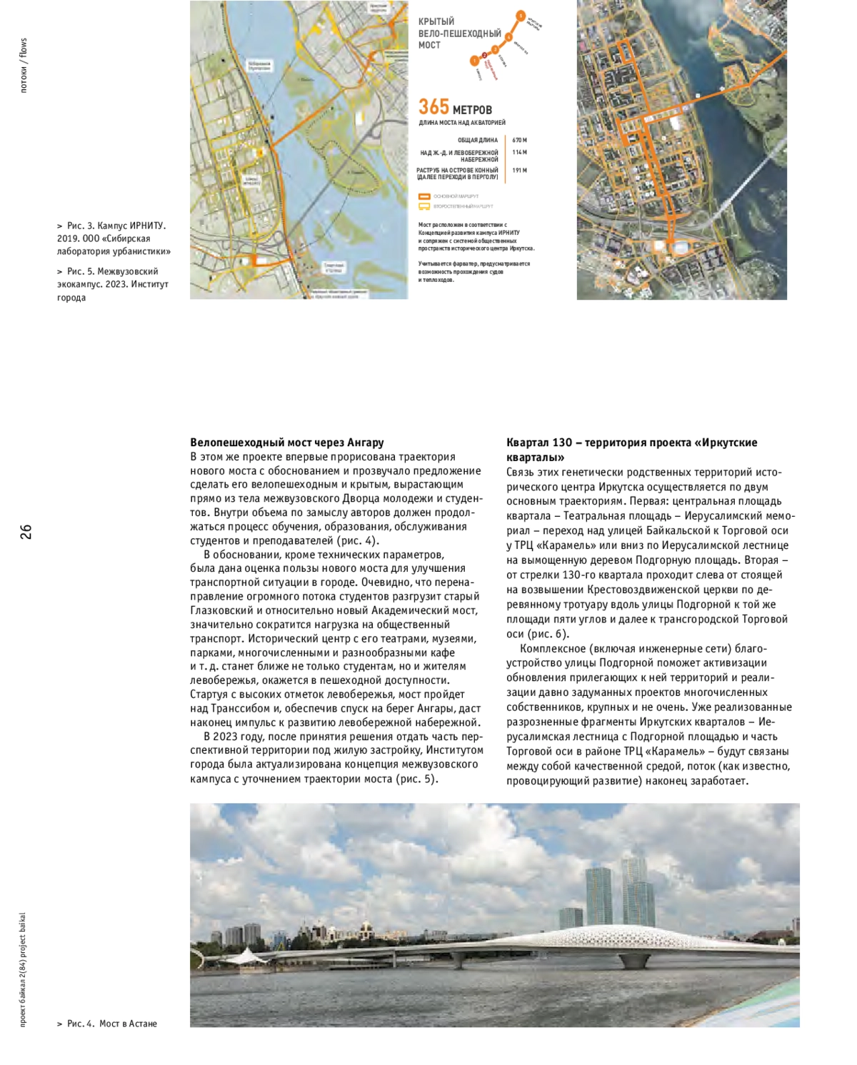 На примере Иркутска рассмотрены связи между проектируемыми и застраивающимися территориями, состояние пешеходных потоков в центре города. С учетом специфики Иркутска, в котором значительную роль играют студенты и преподаватели многочисленных вузов, предложено продлить Зеленый диаметр до левобережного межвузовского кампуса. Актуализировано предложение по решению выявленной проблемы за счет строительства велопешеходного моста через Ангару и расчистки основных осей города - Байкальского луча и перпендикулярного ему Зеленого диаметра.
