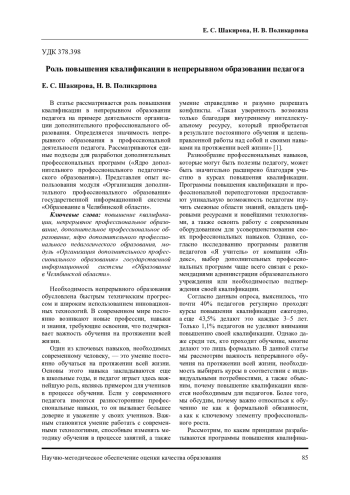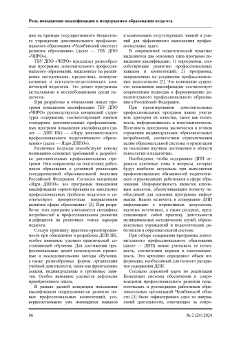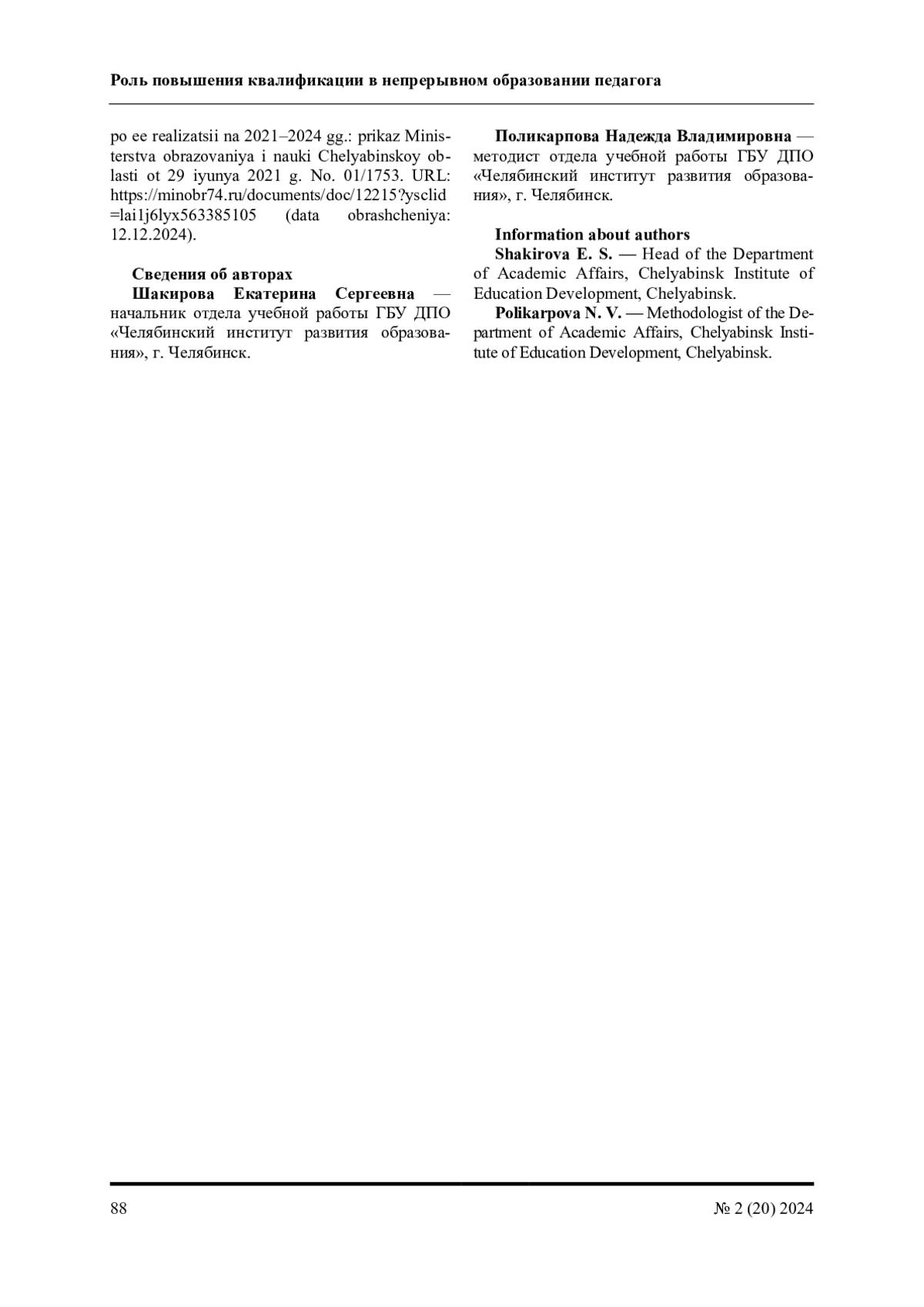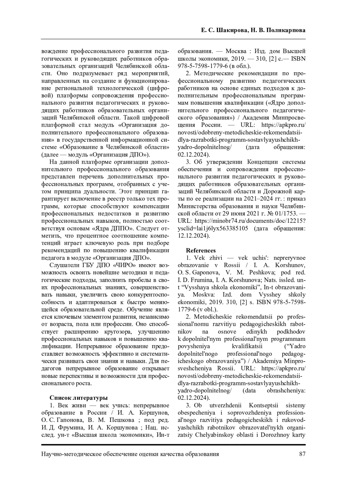 ШАКИРОВА Е. С., ПОЛИКАРПОВА Н. В. РОЛЬ ПОВЫШЕНИЯ КВАЛИФИКАЦИИ В НЕПРЕРЫВНОМ ОБРАЗОВАНИИ ПЕДАГОГА // НАУЧНО-МЕТОДИЧЕСКОЕ ОБЕСПЕЧЕНИЕ ОЦЕНКИ КАЧЕСТВА ОБРАЗОВАНИЯ. 2024. № 2 (20)