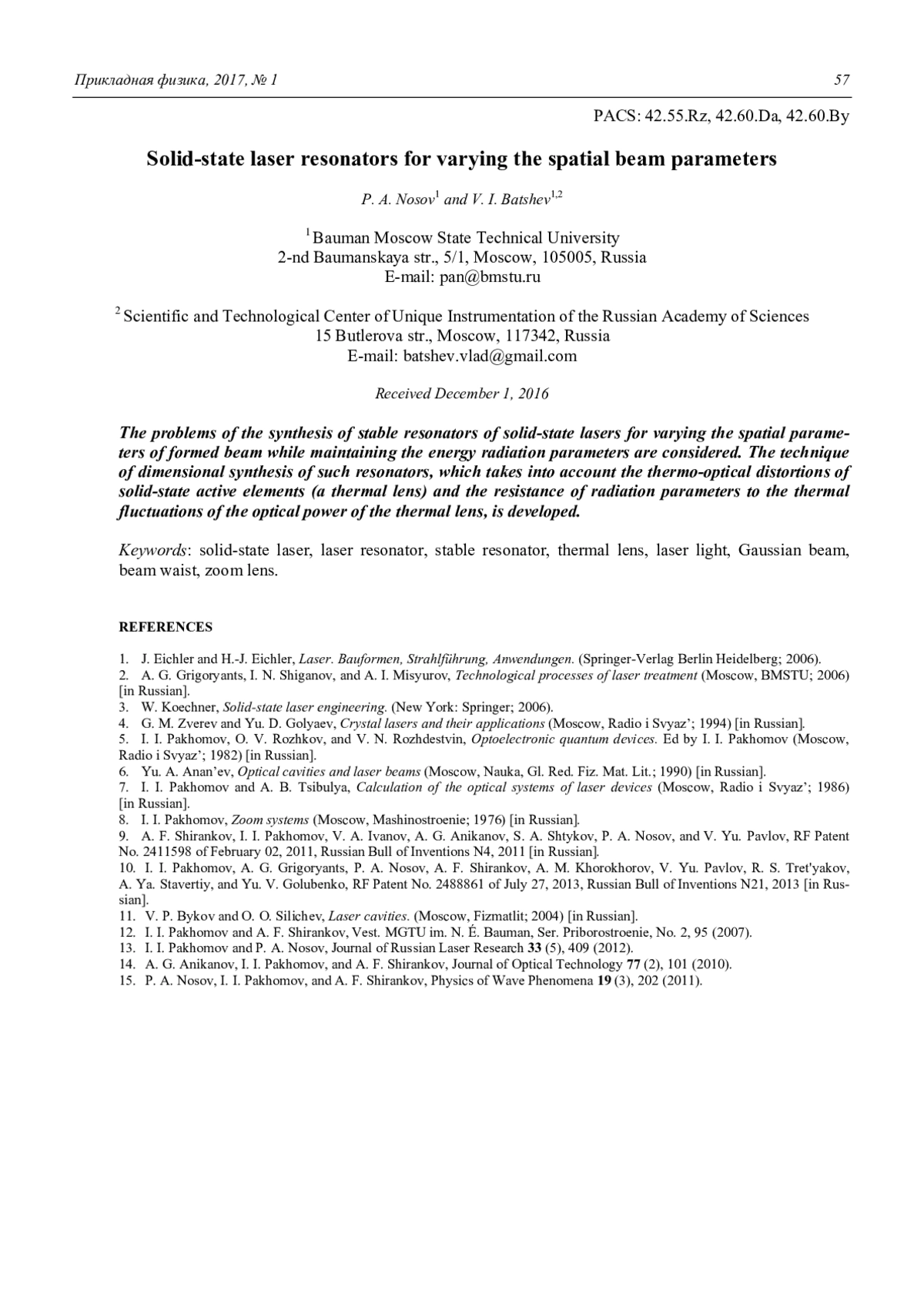НОСОВ П. А., БАТШЕВ В. И. РЕЗОНАТОРЫ ТВЕРДОТЕЛЬНЫХ ЛАЗЕРОВ ДЛЯ ИЗМЕНЕНИЯ ПРОСТРАНСТВЕННЫХ ПАРАМЕТРОВ ПУЧКА // ПРИКЛАДНАЯ ФИЗИКА. 2017. №1