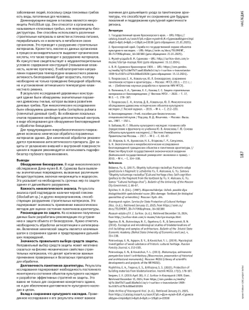 7. Покровская, Е. Н. Микологическое обследование древесины исторических объектов культурного наследия / Е. Н. Покровская, Д. В. Агапов, Ю. Л. Ковальчук // Известия высших учебных заведений. Лесной журнал. - 2019. - № 4(370). - С. 212-220. DOI: 10.17238/0536-1036.2019.4.212-220