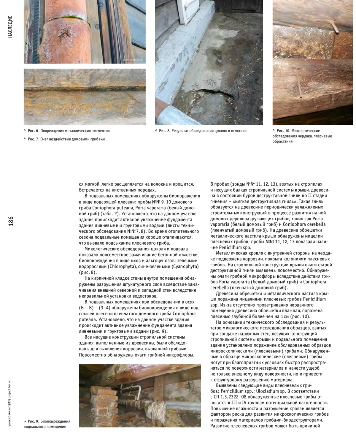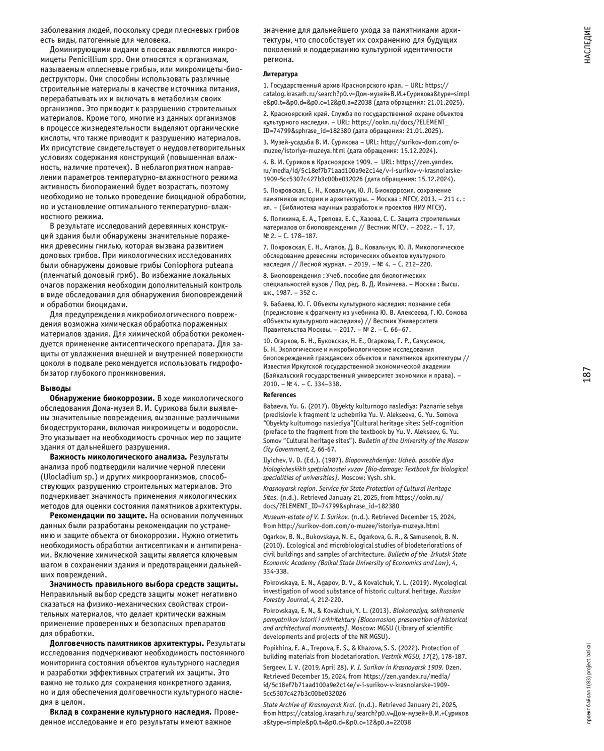 10. Огарков, Б. Н., Буковская, Н. Е., Огаркова, Г. Р., Самусенок, Б. Н. Экологические и микробиологические исследования биоповреждений гражданских объектов и памятников архитектуры // Известия Иркутской государственной экономической академии (Байкальский государственный университет экономики и права). - 2010. - № 4. - С. 334-338.