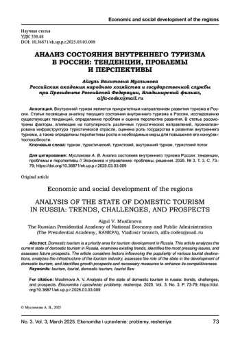 Внутренний туризм является приоритетным направлением развития туризма в России. Статья посвящена анализу текущего состояния внутреннего туризма в России, исследованию существующих тенденций, определению проблем и оценке перспектив развития. В статье рассмотрены факторы, влияющие на популярность различных туристических направлений, проанализирована инфраструктура туристической отрасли, оценена роль государства в развитии внутреннего туризма, а также определены перспективы роста и необходимые меры для повышения его конкурентоспособности.