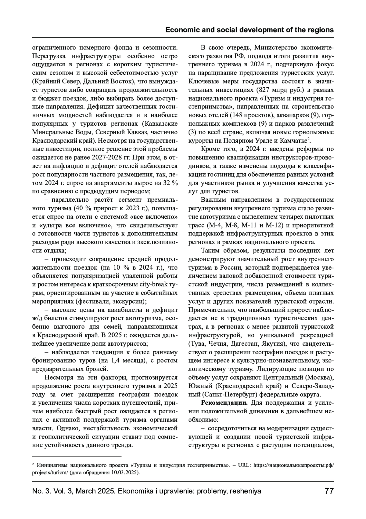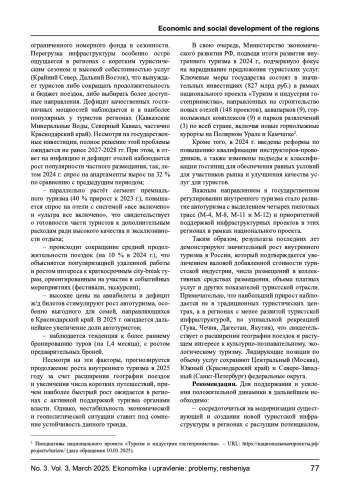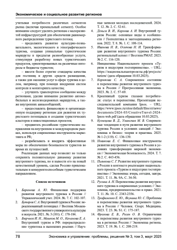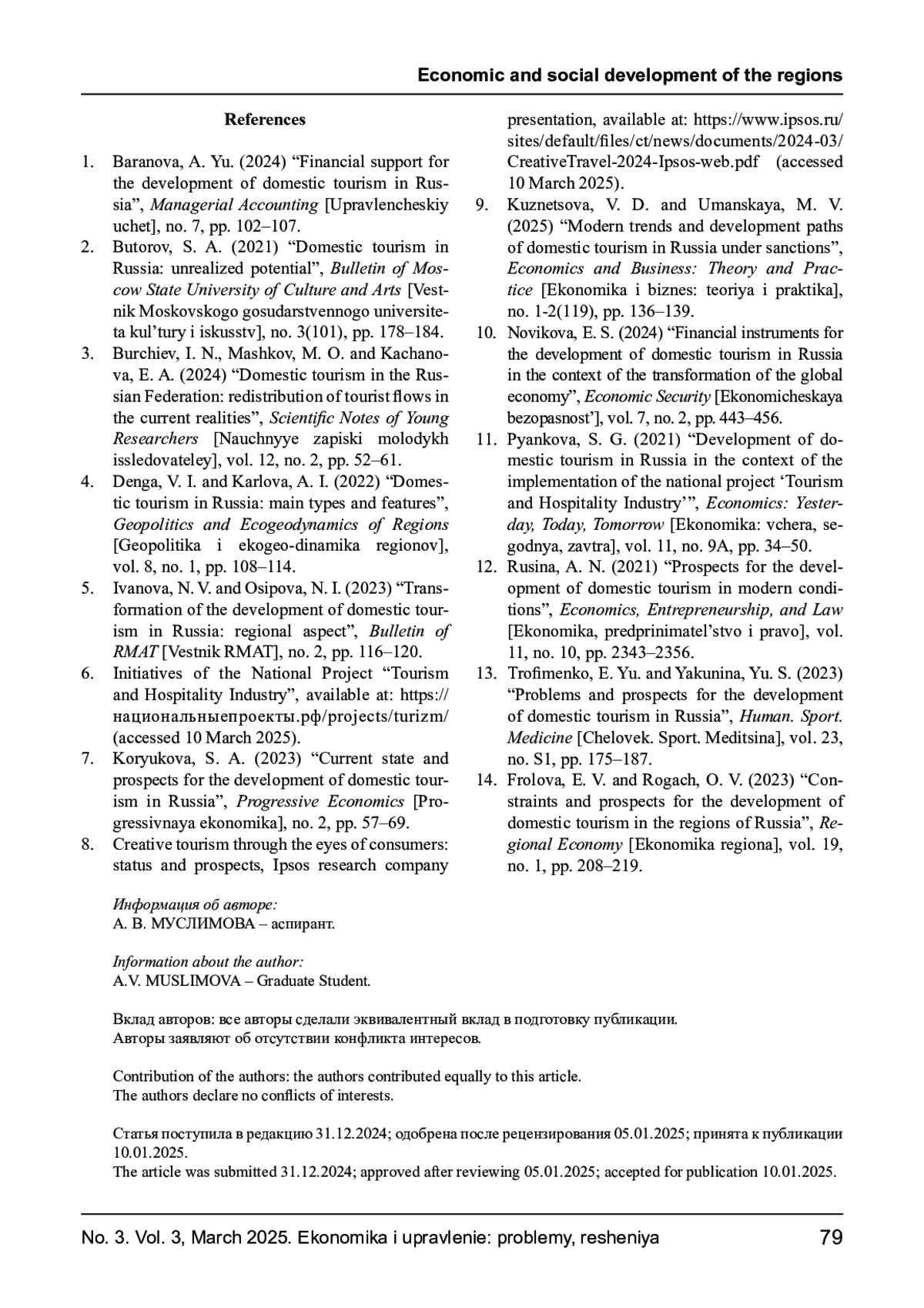 9. Кузнецова В. Д., Уманская М. В. Современные тенденции и пути развития внутреннего туризма России в условиях санкций // Экономика и бизнес: теория и практика. 2025. № 1-2 (119). С. 136-139. EDN: NKEKJI