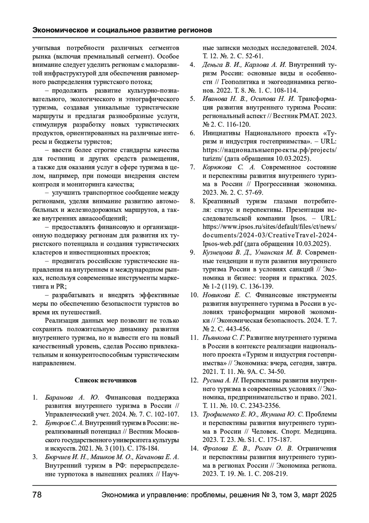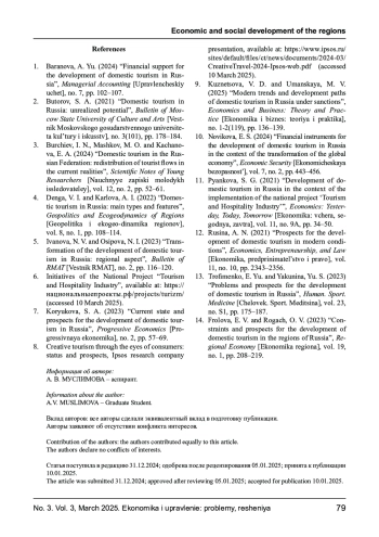 3. Бюрчиев И. Н., Машков М. О., Качанова Е. А. Внутренний туризм в РФ: перераспределение турпотока в нынешних реалиях // Научные записки молодых исследователей. 2024. Т. 12. №. 2. С. 52-61. EDN: LDKUTG