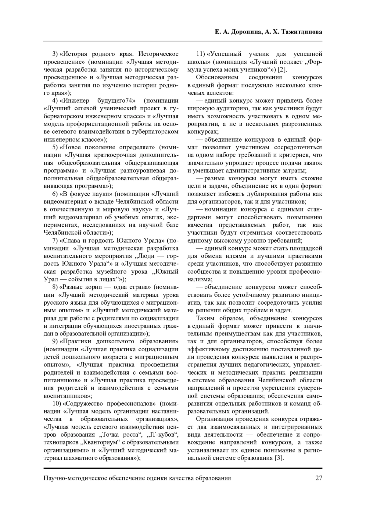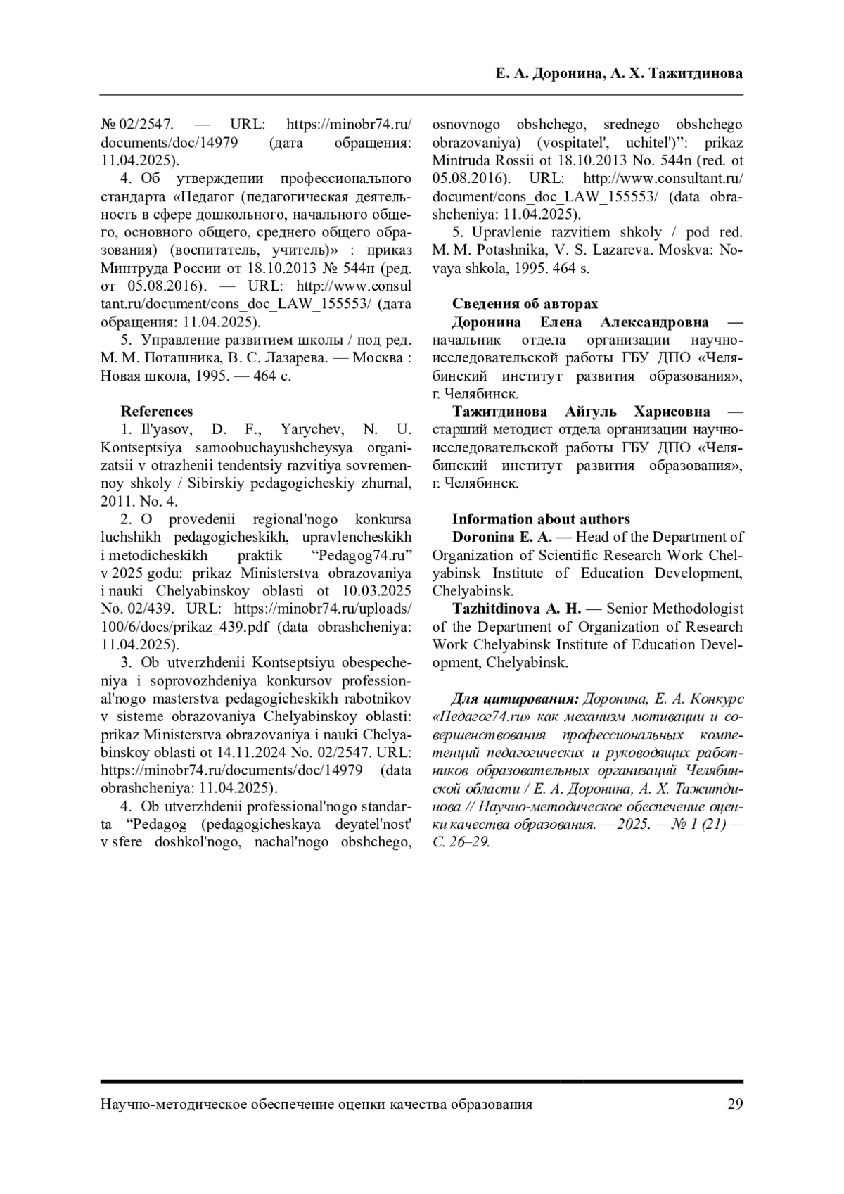 ТАЖИТДИНОВА А. Х., ДОРОНИНА Е. А. КОНКУРС «ПЕДАГОГ 74» КАК МЕХАНИЗМ МОТИВАЦИИ И СОВЕРШЕНСТВОВАНИЯ ПРОФЕССИОНАЛЬНЫХ КОМПЕТЕНЦИЙ ПЕДАГОГИЧЕСКИХ И РУКОВОДЯЩИХ РАБОТНИКОВ ОБРАЗОВАТЕЛЬНЫХ ОРГАНИЗАЦИЙ ЧЕЛЯБИНСКОЙ ОБЛАСТИ // НАУЧНО-МЕТОДИЧЕСКОЕ ОБЕСПЕЧЕНИЕ ОЦЕНКИ КАЧЕСТВА ОБРАЗОВАНИЯ. 2025. № 1 (21)