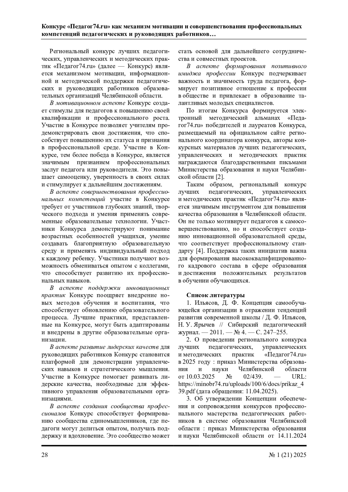 Статья: КОНКУРС «ПЕДАГОГ 74» КАК МЕХАНИЗМ МОТИВАЦИИ И СОВЕРШЕНСТВОВАНИЯ ПРОФЕССИОНАЛЬНЫХ КОМПЕТЕНЦИЙ ПЕДАГОГИЧЕСКИХ И РУКОВОДЯЩИХ РАБОТНИКОВ ОБРАЗОВАТЕЛЬНЫХ ОРГАНИЗАЦИЙ ЧЕЛЯБИНСКОЙ ОБЛАСТИ (2025)
