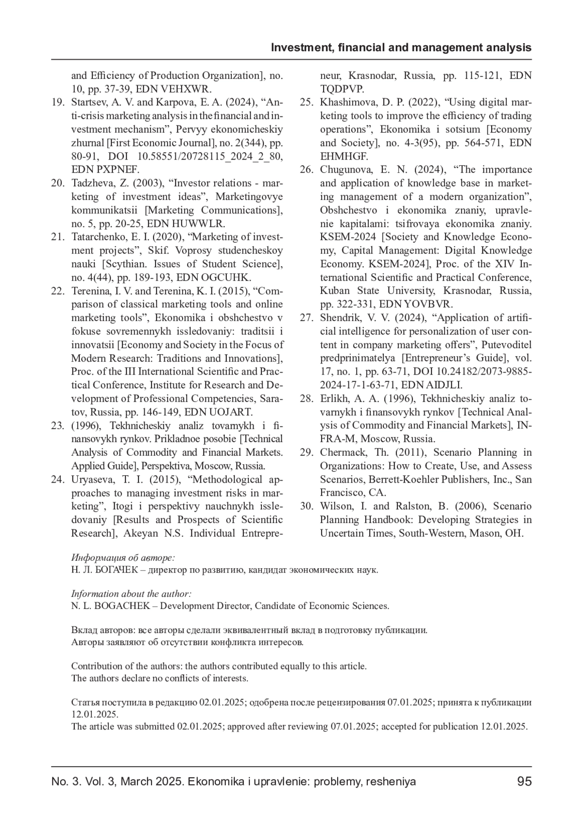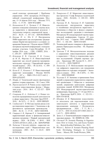 19. Старцев А. В., Карпова Е. А. Антикризисный маркетинговый анализ в финансово-инвестиционном механизме // Первый экономический журнал. - 2024. - № 2(344). - С. 80-91. DOI: 10.58551/20728115_2024_2_80 EDN: PXPNEF