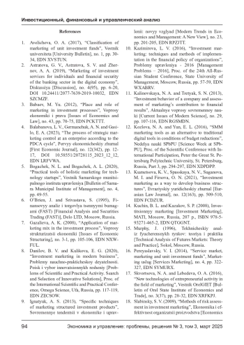 3. Бабаев М. Ю. Место и роль маркетинга в инвестиционных процессах // Вопросы экономики и права. - 2012. - № 43. - С. 70-75. EDN: PCKTTT