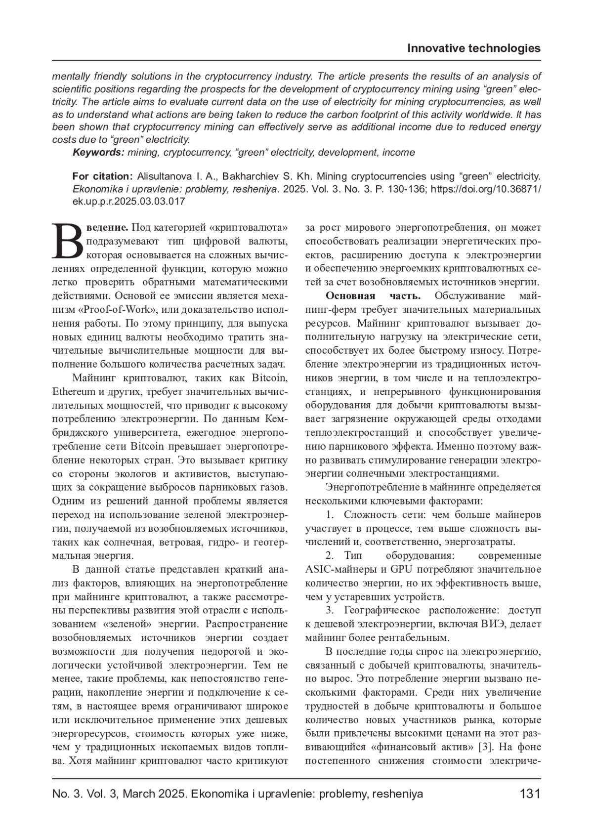 АЛИСУЛТАНОВА И. А., БАХАРЧИЕВ С. Х. МАЙНИНГ КРИПТОВАЛЮТЫ С ИСПОЛЬЗОВАНИЕМ «ЗЕЛЕНОЙ» ЭЛЕКТРОЭНЕРГИИ // ЭКОНОМИКА И УПРАВЛЕНИЕ: ПРОБЛЕМЫ, РЕШЕНИЯ. 2025. ТОМ 3 № 3