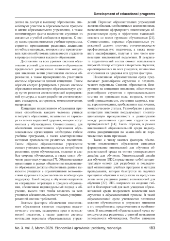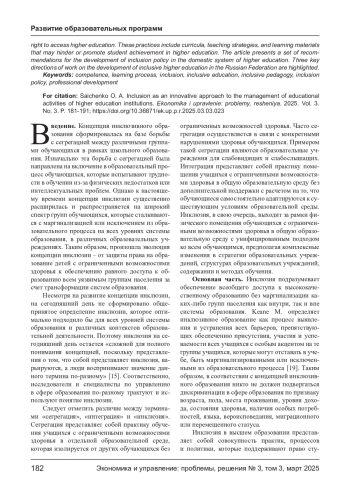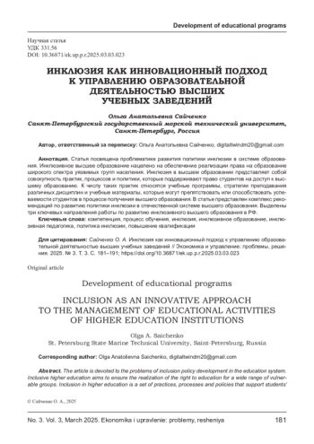 САЙЧЕНКО О. А. ИНКЛЮЗИЯ КАК ИННОВАЦИОННЫЙ ПОДХОД К УПРАВЛЕНИЮ ОБРАЗОВАТЕЛЬНОЙ ДЕЯТЕЛЬНОСТЬЮ ВЫСШИХ УЧЕБНЫХ ЗАВЕДЕНИЙ // ЭКОНОМИКА И УПРАВЛЕНИЕ: ПРОБЛЕМЫ, РЕШЕНИЯ. 2025. ТОМ 3 № 3