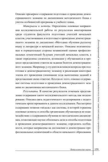 Материалы и методы. Определены основные направления исследовательской работы по результатам анкетирования среди студентов факультета подготовки учителей начальных классов, участвовавших в подготовке и проведении демонстрационного экзамена по дисциплине «Методика обучения русскому языку и литературе в начальной школе». Описаны положительные и отрицательные стороны независимой оценки профессиональных компетенций будущих учителей начальных классов, а также определены сложности, возникшие у обучающихся в процессе представления ответов на задания билетов демонстрационного экзамена. Например, у студентов возникли вопросы при подготовке к демонстрационному экзамену и реализации некоторых этапов его проведения (понимание хода выполнения заданий и представление своих ответов). Исходя из этого, описано содержание системы подготовки и проведения демонстрационного экзамена по дисциплинам методического блока.