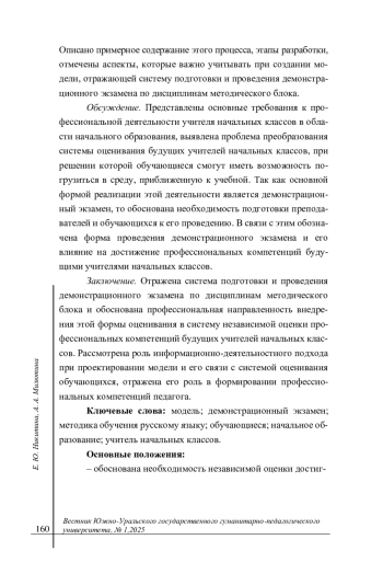 Заключение. Отражена система подготовки и проведения демонстрационного экзамена по дисциплинам методического блока и обоснована профессиональная направленность внедрения этой формы оценивания в систему независимой оценки профессиональных компетенций будущих учителей начальных классов. Рассмотрена роль информационно-деятельностного подхода при проектировании модели и его связи с системой оценивания обучающихся, отражена его роль в формировании профессиональных компетенций педагога. Основные положения: - обоснована необходимость независимой оценки достигнутых студентами профессиональных компетенций по дисциплинам методического блока; - обозначены некоторые результаты анкетирования обучающихся в рамках исследования; - описаны этапы подготовки и проведения демонстрационного экзамена по дисциплинам методического блока.