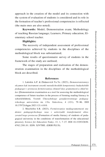 1. Лукшин, А. П., Жданович Ю. Е. Демонстрационный экзамен как инструмент оценки методических компетенций будущих педагогов в процессе формирования читательской грамотности у школьников // Вестник Чувашского государственного педагогического университета им. И.Я. Яковлева. 2023. № 4(121). С. 79-86. DOI: 10.37972/chgpu.2023.121.4.010 EDN: RPNRHV