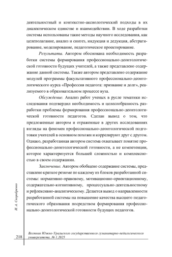 Обсуждение. Анализ работ ученых в русле тематики исследования подтвердил необходимость и целесообразность разработки проблемы формирования профессионально-деонтологической готовности педагогов. Сделан вывод о том, что предложенные автором и отраженные в других исследованиях взгляды на феномен профессионально-деонтологической подготовки учителей в основном похожи и коррелируют друг с другом. Однако, разработанная автором система охватывает понятие профессионально-деонтологической готовности, а не компетенции, которое характеризуется большей сложностью и комплексностью в своем содержании.