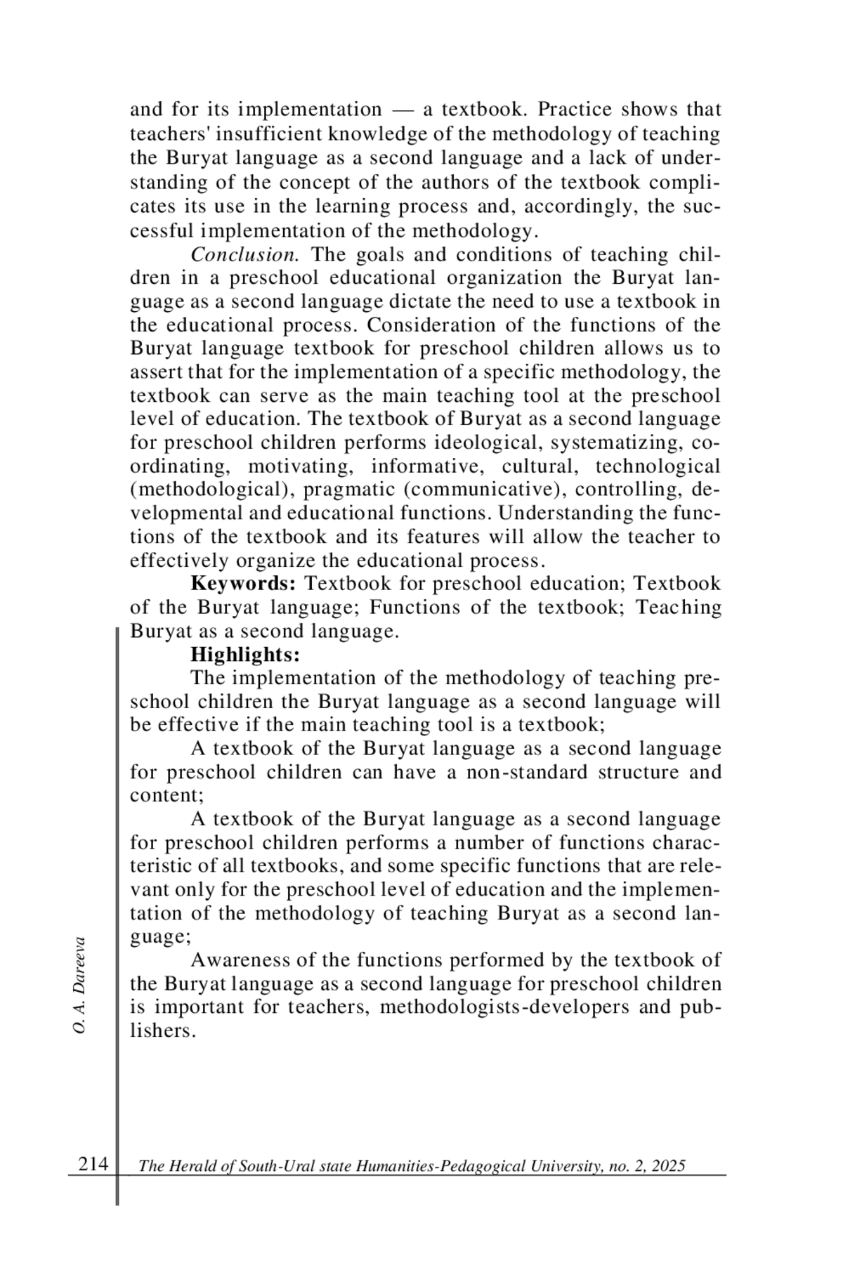 Заключение. Цели и условия обучения детей в дошкольной образовательной организации бурятскому языку как второму диктуют необходимость использования учебника в образовательном процессе. Рассмотрение функций учебника бурятского языка для детей дошкольного возраста позволяет утверждать, что для реализации конкретной методики учебник может служить основным средством обучения и на дошкольном уровне образования. Учебник бурятского языка для детей дошкольного возраста выполняет идеологическую, систематизирующую, координирующую, мотивирующую, информативную, культуроведческую, технологическую (методическую), прагматическую (коммуникативную), контролирующую, развивающе-воспитательную функции. Понимание функций учебника и его особенностей позволят учителю эффективно организовать образовательный процесс. Основные положения: - учебник может представлять собой основное средство реализации методики обучения бурятскому языку как второму детей дошкольного возраста; - содержание и структура учебника бурятского языка как второго для детей дошкольного возраста могут иметь нестандартность представления и творческий подход; - учебник бурятского языка для детей дошкольного возраста может выполнять не только универсальные, но специфические функции, характерные для возраста адресата; - учителям бурятского языка и методистам важно знать функции учебника для эффективной реализации методики обучения детей дошкольного возраста бурятскому языку как второму.