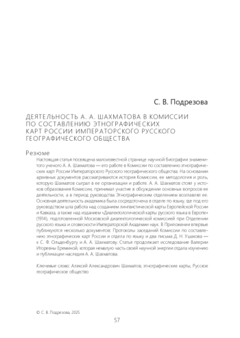 ПОДРЕЗОВА С. В. ДЕЯТЕЛЬНОСТЬ А. А. ШАХМАТОВА В КОМИССИИ ПО СОСТАВЛЕНИЮ ЭТНОГРАФИЧЕСКИХ КАРТ РОССИИ ИМПЕРАТОРСКОГО РУССКОГО ГЕОГРАФИЧЕСКОГО ОБЩЕСТВА // СЛОВЕСНОСТЬ И ИСТОРИЯ. 2025. № 2
