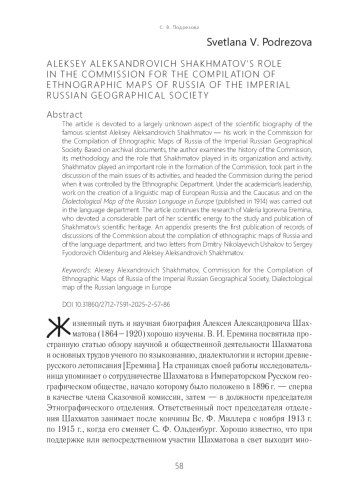 Настоящая статья посвящена малоизвестной странице научной биографии знаменитого ученого А. А. Шахматова — его работе в Комиссии по составлению этнографических карт России Императорского Русского географического общества. На основании архивных документов рассматриваются история Комиссии, ее методология и роль, которую Шахматов сыграл в ее организации и работе. А. А. Шахматов стоял у истоков образования Комиссии, принимал участие в обсуждении основных вопросов ее деятельности, а в период руководства Этнографическим отделением возглавлял ее. Основная деятельность академика была сосредоточена в отделе по языку, где под его руководством шла работа над созданием лингвистической карты Европейской России и Кавказа, а также над изданием «Диалектологической карты русского языка в Европе» (1914), подготовленной Московской диалектологической комиссией при Отделении русского языка и словесности Императорской Академии наук. В Приложении впервые публикуются несколько документов: Протоколы заседаний Комиссии по составлению этнографических карт России и отдела по языку и два письма Д. Н. Ушакова — к С. Ф. Ольденбургу и А. А. Шахматову. Статья продолжает исследование Валерии Игоревны Ереминой, которая немалую часть своей научной энергии отдала изучению и публикации наследия А. А. Шахматова