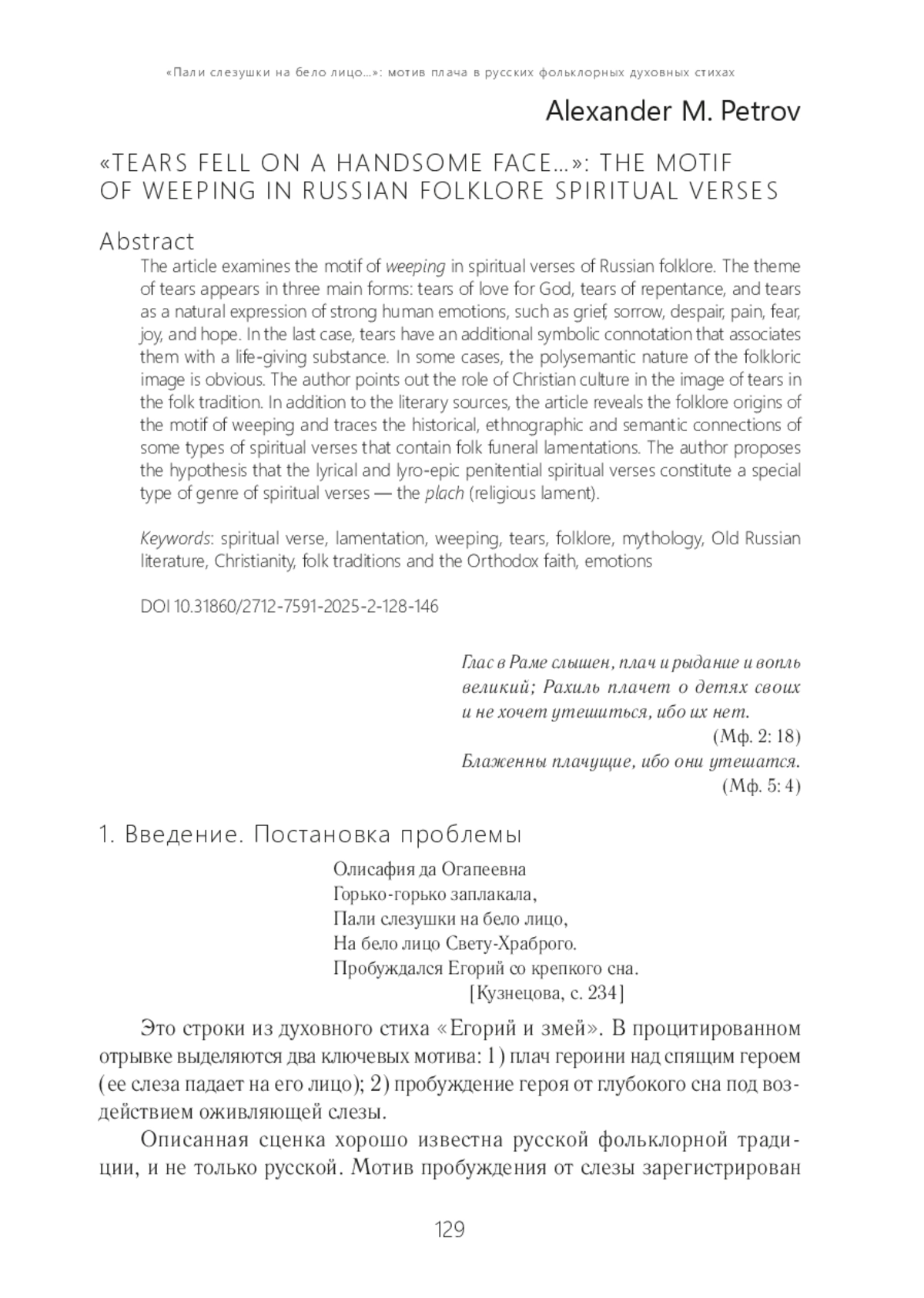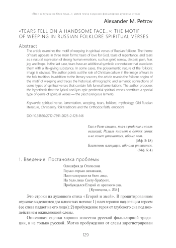 В статье на материале русских фольклорных духовных стихов рассматривается мотив плача. Тема плача выражена при помощи образа слез, который выступает в трех основных значениях: а) слезы умильные; б) слезы покаянные; в) слезы как естественный выразитель сильной бытовой эмоции (горе, скорбь, отчаяние, боль, страх, радость, надежда). В последнем случае имеется добавочная символическая коннотация: слеза предстает как субстанция жизненной силы. В отдельных случаях необходимо констатировать полисемантизм фольклорного образа. Фольклористический анализ осуществляется с учетом исторического контекста, художественно-эстетических традиций, стоящих за мотивом плача и образом слез. Отмечается роль топики христианской культуры в распространении в народной традиции образов умильных и покаянных слез. Помимо книжных, выявляются фольклорные истоки мотива, устанавливается историко-этнографическая и семантическая связь некоторых типов плачевых духовных стихов с народными причитаниями. Обосновывается выделение плача в отдельную жанровую разновидность лирического (лиро-эпического) покаянного духовного стиха