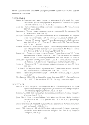 Статья посвящена одному из наиболее редких эпических духовных стихов устной традиции. Известны всего лишь три его записи, осуществленные во второй половине XIX столетия. Сюжет, восходящий к житийной литературе, отразил период гонений на христиан в нач. IV в., во время правления римского императора Диоклетиана. В основе статьи выявление сходств и отличий вариантов стиха и установление его связей с эпическими духовными стихами других сюжетов, также отразившими тему святого мученичества. Главным образом это стих о Егории Храбром. Несмотря на крайнюю скудость материала для анализа, сопоставление трех зафиксированных текстов «Кирика и Улиты» позволяет выделить две разные версии этого духовного стиха. Одна из них представлена вариантом, записанным в Олонецкой губернии от известного былинщика Василия Петровича Щеголенка, другая — двумя близкими текстами, зафиксированными собирателями в Вятской губернии, один из которых был записан с пения.