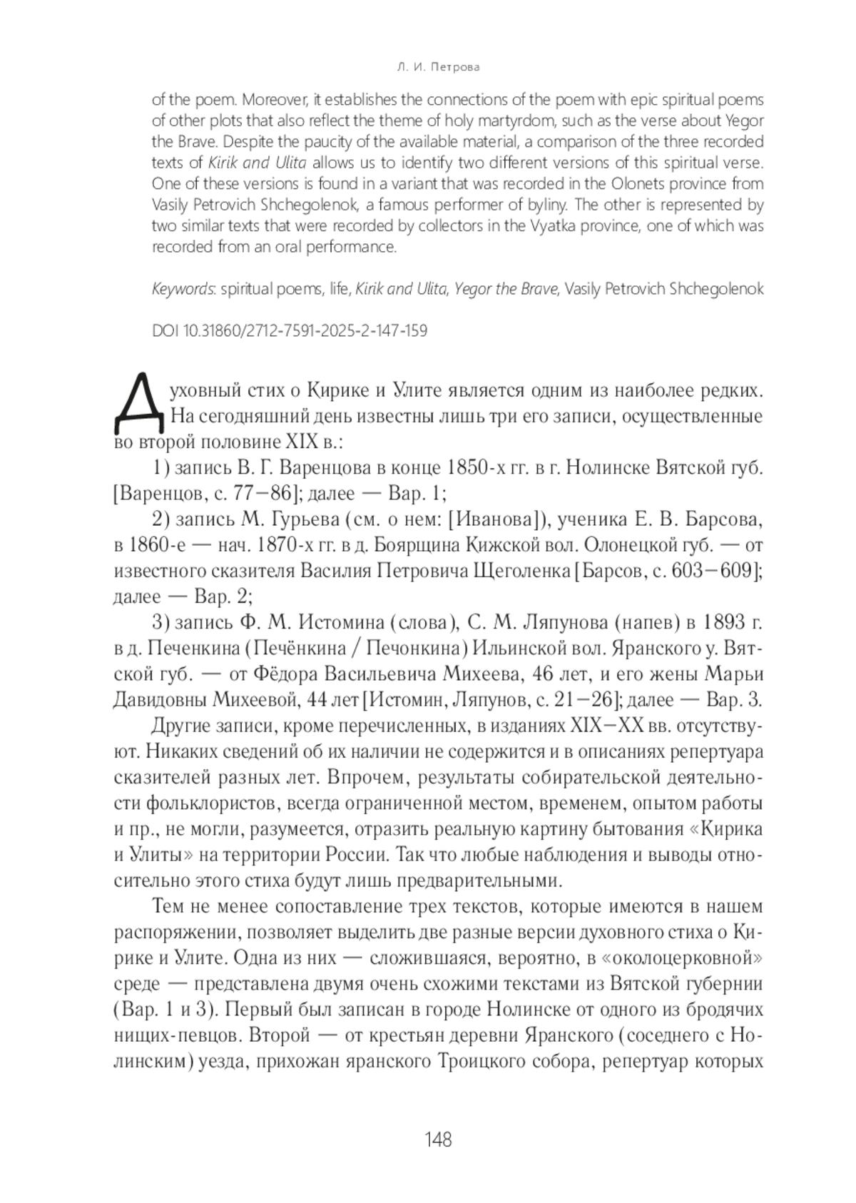 ПЕТРОВА Л. И. СТИХ О КИРИКЕ И УЛИТЕ В НАРОДНОЙ ЭПИЧЕСКОЙ ТРАДИЦИИ // СЛОВЕСНОСТЬ И ИСТОРИЯ. 2025. № 2