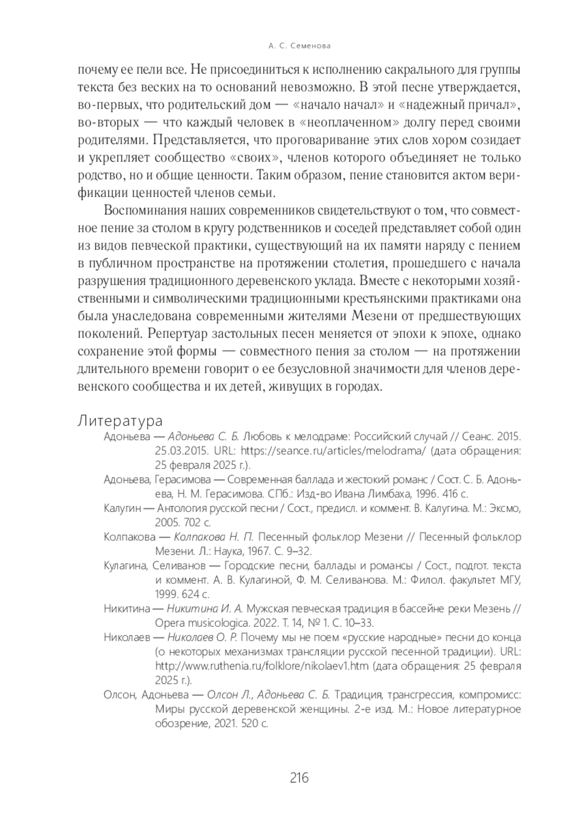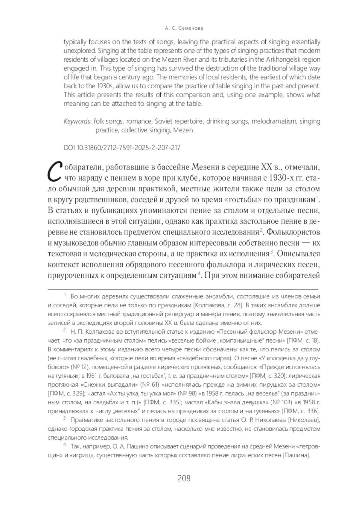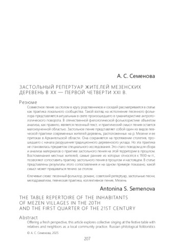СЕМЕНОВА А.С. ЗАСТОЛЬНЫЙ РЕПЕРТУАР ЖИТЕЛЕЙ МЕЗЕНСКИХ ДЕРЕ - ВЕНЬ В XX - ПЕРВОЙ ЧЕТВЕРТИ XXI В // СЛОВЕСНОСТЬ И ИСТОРИЯ. 2025. № 2