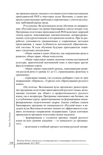 Обсуждение. Вьетнамские вузы предлагают разносторонние программы подготовки преподавателей русского языка, включающие изучение как общего и профессионального русского языка, так и литературы. Программы охватывают как базовые, так и углубленные курсы, ориентированные на формирование квалифицированных педагогических кадров. Анализ учебных планов бакалаврских программ по специальности «Русский язык» в ведущих вузах Вьетнама позволяет оценить их эффективность и выявить возможные направления модернизации. Среди ключевых преимуществ программ подготовки можно выделить: - формирование у студентов прочных знаний русского языка на всех уровнях владения - от начального до продвинутого; - включение в учебный процесс изучения русской литера- туры и культуры, что способствует более глубокому пониманию и осмыслению российской культурной традиции; - сбалансированное сочетание теоретической и практической подготовки.