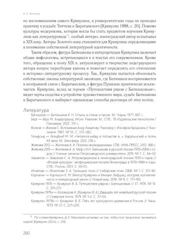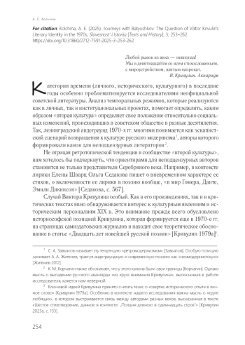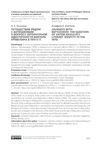 КОЛЧИНА А. Е. ПУТЕШЕСТВИЯ РЯДОМ С БАТЮШКОВЫМ: К ВОПРОСУ ЛИТЕРАТУРНОЙ ИДЕНТИЧНОСТИ ВИКТОРА КРИВУЛИНА В 1970-Е ГГ // СЛОВЕСНОСТЬ И ИСТОРИЯ. 2025. № 3
