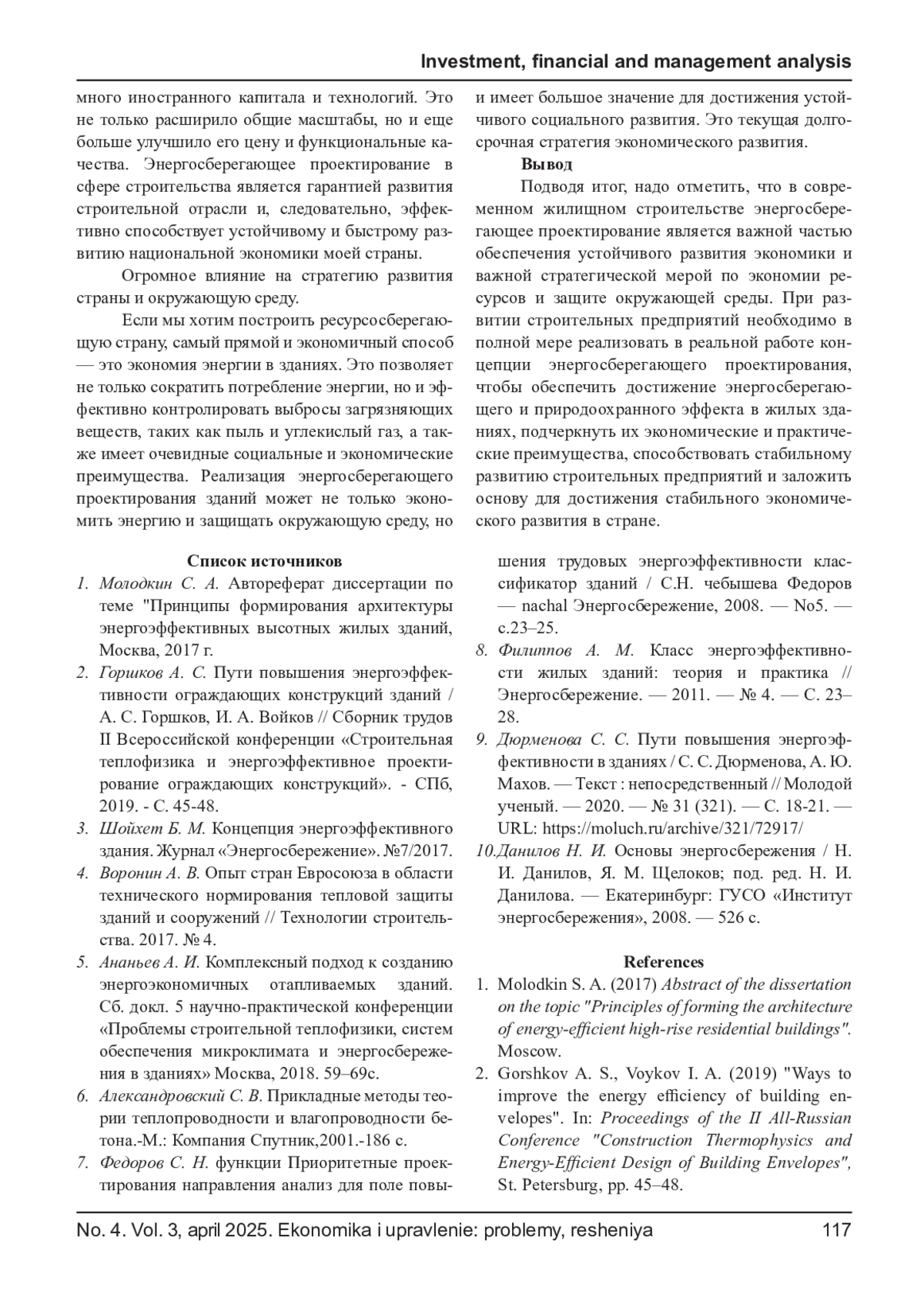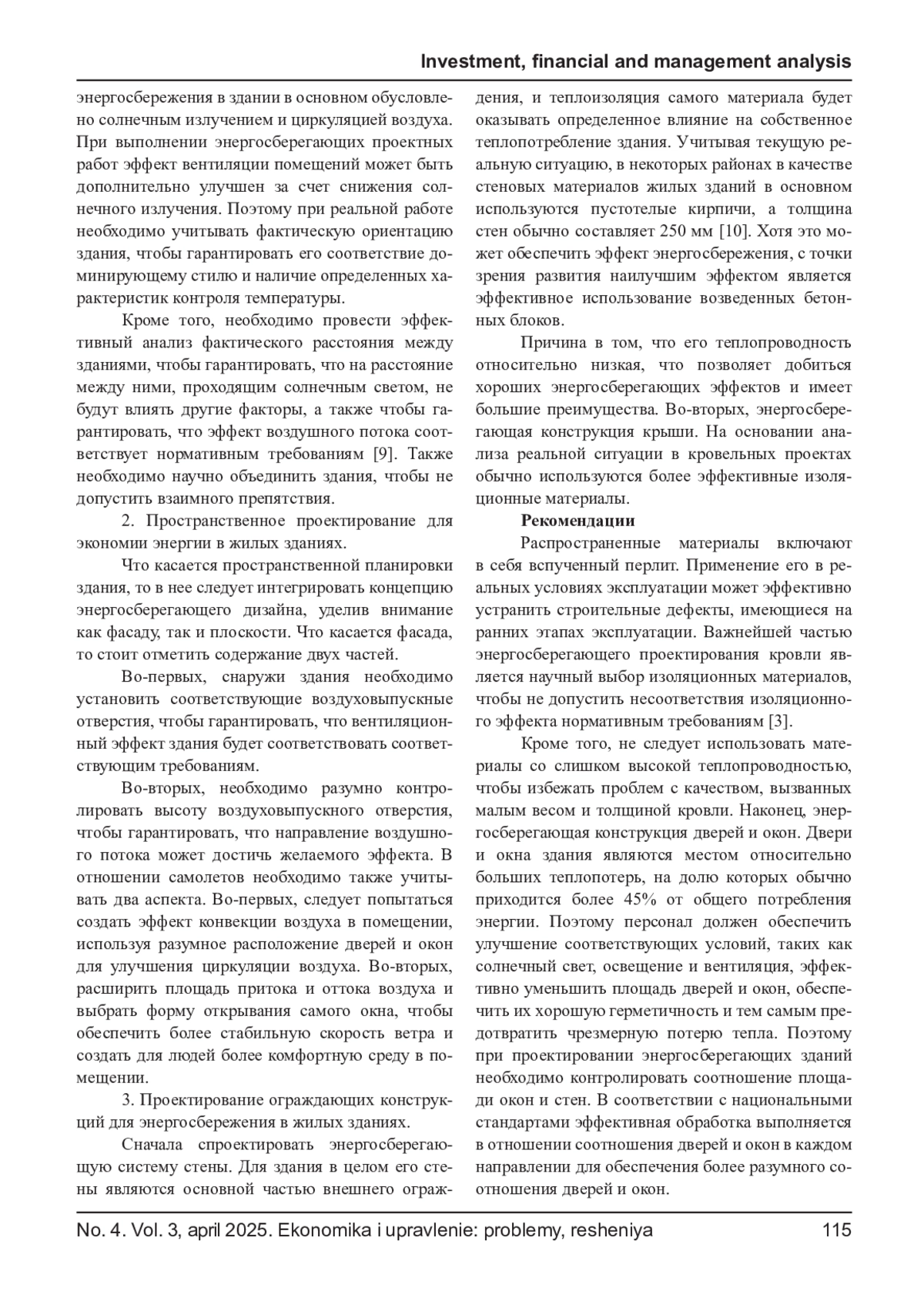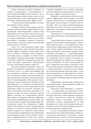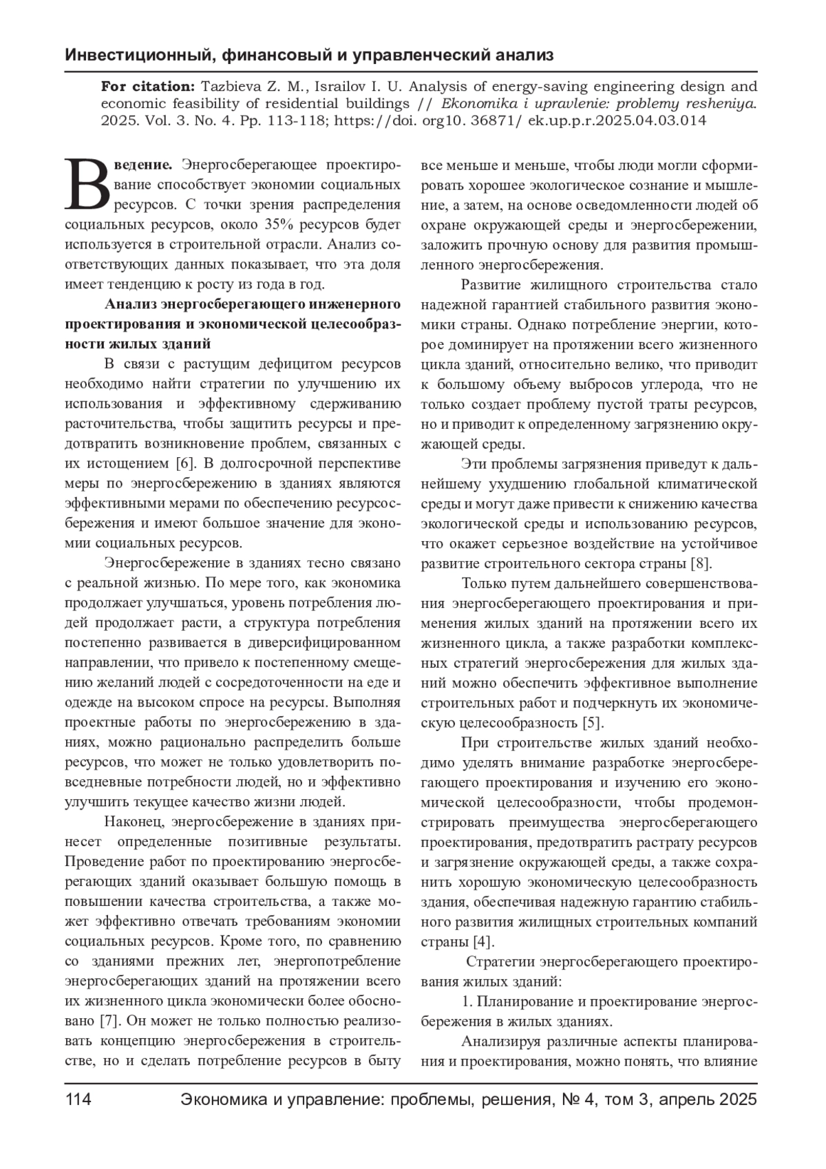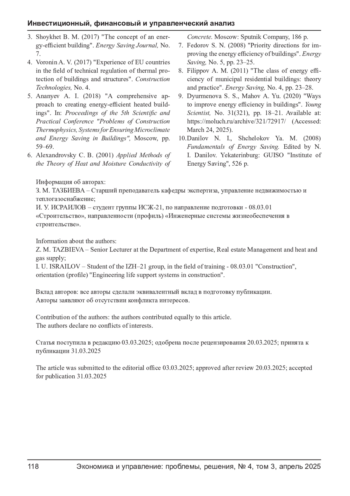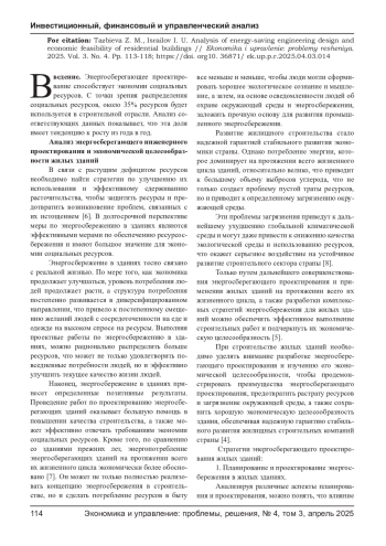 ТАЗБИЕВА З. М., ИСРАИЛОВ И. У. АНАЛИЗ ЭНЕРГОСБЕРЕГАЮЩЕГО ИНЖЕНЕРНОГО ПРОЕКТИРОВАНИЯ И ЭКОНОМИЧЕСКОЙ ЦЕЛЕСООБРАЗНОСТИ ЖИЛЫХ ЗДАНИЙ // ЭКОНОМИКА И УПРАВЛЕНИЕ: ПРОБЛЕМЫ, РЕШЕНИЯ. 2025. ТОМ 3 № 4