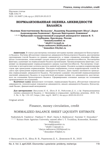 В статье рассмотрены основные методики оценки ликвидности бухгалтерского баланса. Изучены абсолютные показатели ликвидности бухгалтерского баланса, рассмотрены группировки статей баланса по уровню ликвидности, а также отражены основные общепринятые соотношения, позволяющие сделать вывод об уровне платежеспособности. Рассмотрены факторы, влияющие на нормализацию баланса организации. Проанализированы факторы, влияющие на формирование нормализованного уровня платежеспособности. Рассмотрены теоретические и методические аспекты расчета данной методики. Изложен алгоритм корректировки строк при проведении нормализации. Наглядно изображены статьи корректировок статей баланса при проведении нормализации ликвидности баланса. Дана оценка значимости проведения нормализации ликвидности баланса. Рассмотрено влияние отклонений нормализованных значений ликвидного баланса от классической методики оценки его ликвидности, рассчитанного на основании бухгалтерского баланса. Сформированы основные выводы на основании произведенного исследования.