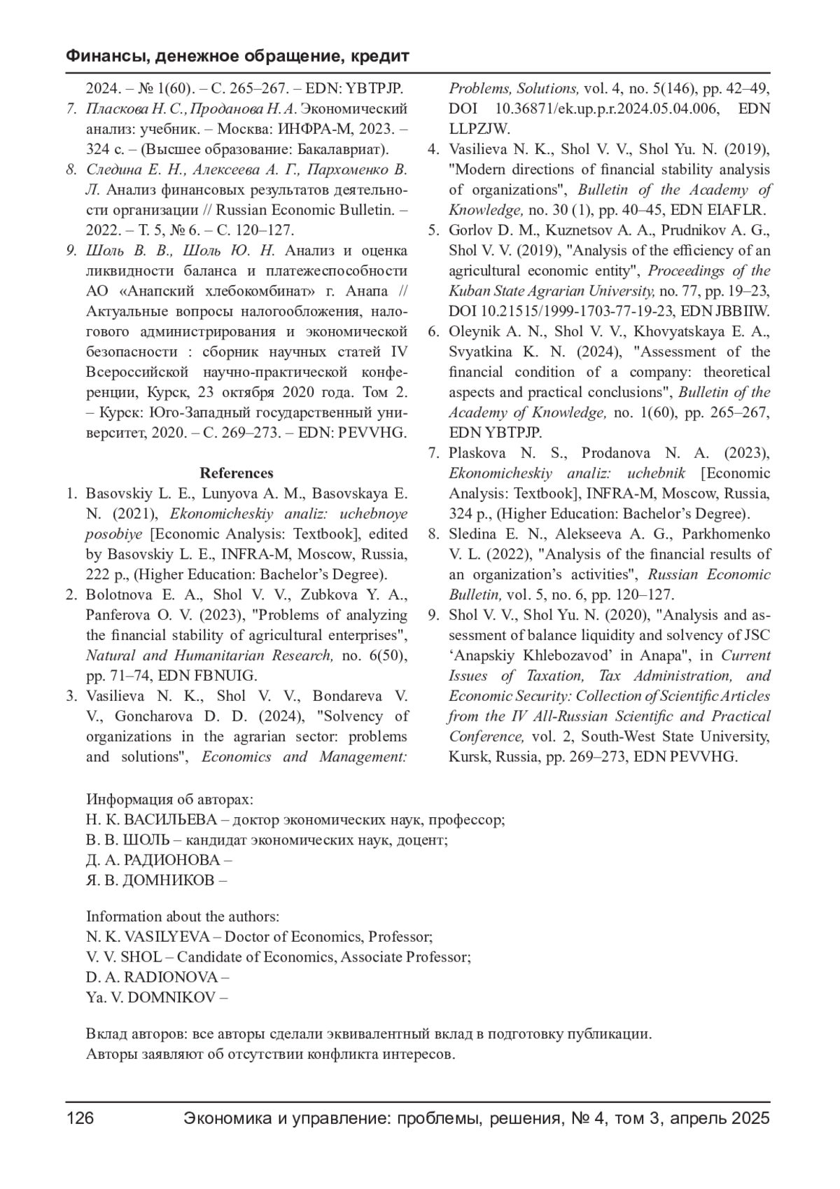 3. Васильева Н. К., Шоль В. В., Бондарева В. В., Гончарова Д. Д. Платежеспособность организаций аграрного сектора: проблемы и пути решения // Экономика и управление: проблемы, решения. - 2024. - Т. 4, № 5(146). - С. 42-49. - -. DOI: 10.36871/ek.up.p.r.2024.05.04.006 EDN: LLPZJW