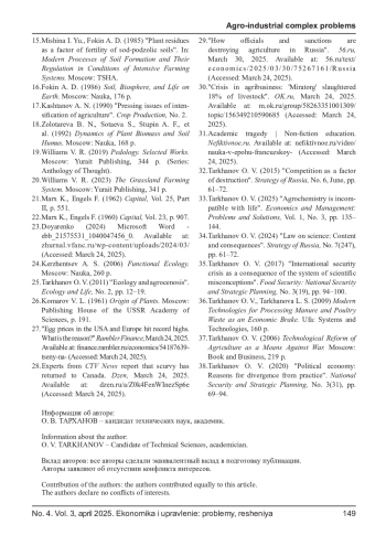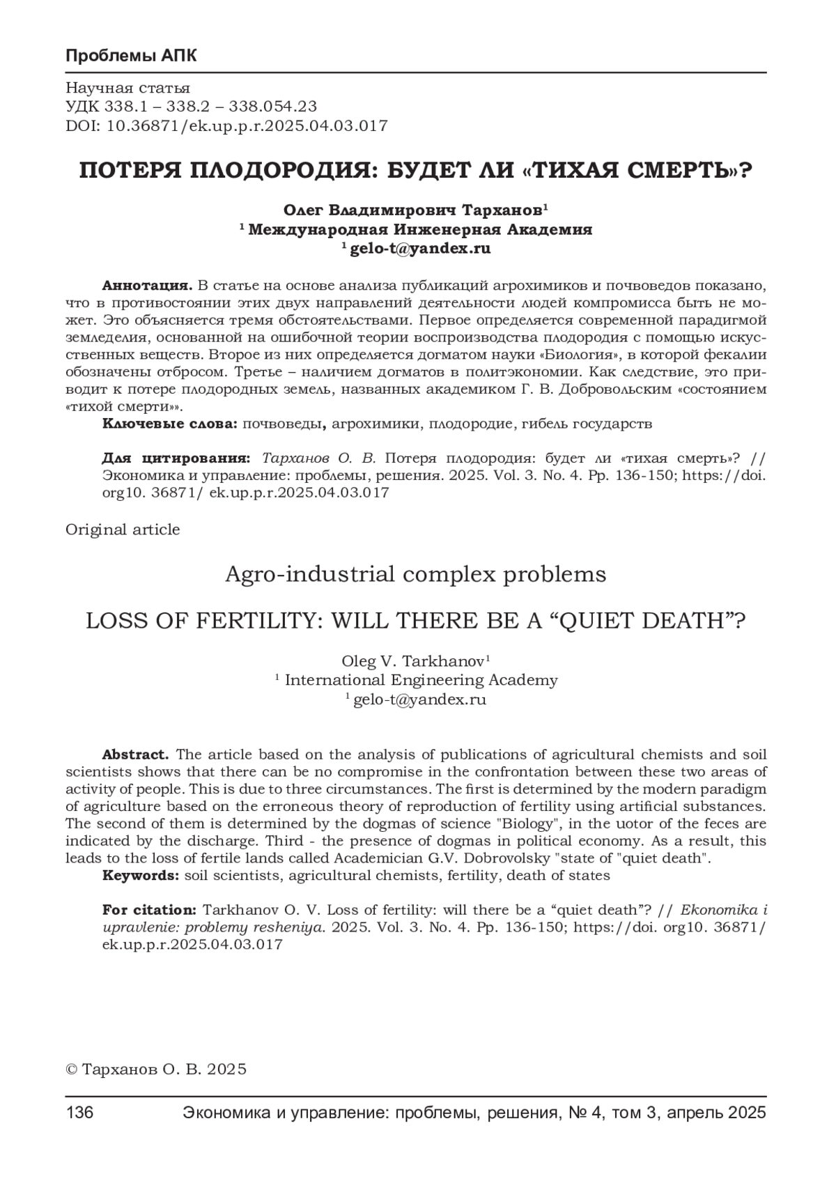 ТАРХАНОВ О. В. ПОТЕРЯ ПЛОДОРОДИЯ: БУДЕТ ЛИ "ТИХАЯ СМЕРТЬ"? // ЭКОНОМИКА И УПРАВЛЕНИЕ: ПРОБЛЕМЫ, РЕШЕНИЯ. 2025. ТОМ 3 № 4