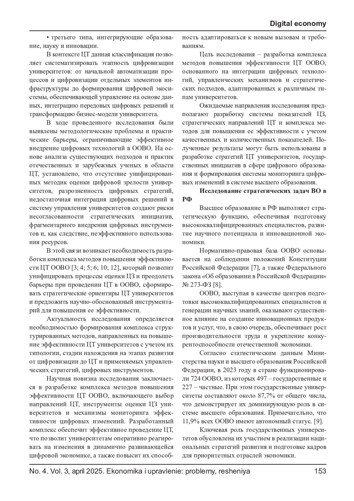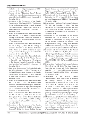 Система высшего образования играет стратегическую роль в обеспечении научно-технологического развития РФ [23; 24; 26; 11], что обусловливает необходимость ее адаптации к условиям цифровой экономики, где основными активами становятся интеллектуальный капитал и технологические разработки.