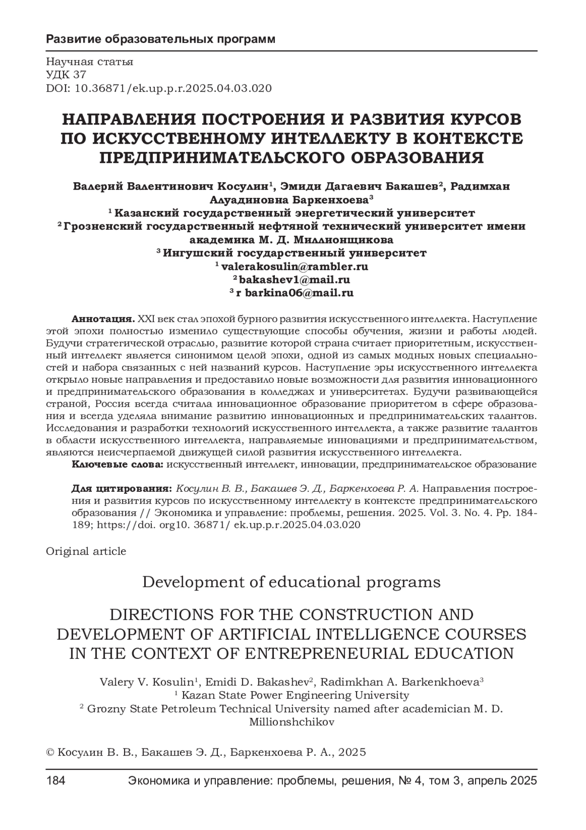 XXI век стал эпохой бурного развития искусственного интеллекта. Наступление этой эпохи полностью изменило существующие способы обучения, жизни и работы людей. Будучи стратегической отраслью, развитие которой страна считает приоритетным, искусственный интеллект является синонимом целой эпохи, одной из самых модных новых специальностей и набора связанных с ней названий курсов. Наступление эры искусственного интеллекта открыло новые направления и предоставило новые возможности для развития инновационного и предпринимательского образования в колледжах и университетах. Будучи развивающейся страной, Россия всегда считала инновационное образование приоритетом в сфере образования и всегда уделяла внимание развитию инновационных и предпринимательских талантов. Исследования и разработки технологий искусственного интеллекта, а также развитие талантов в области искусственного интеллекта, направляемые инновациями и предпринимательством, являются неисчерпаемой движущей силой развития искусственного интеллекта.