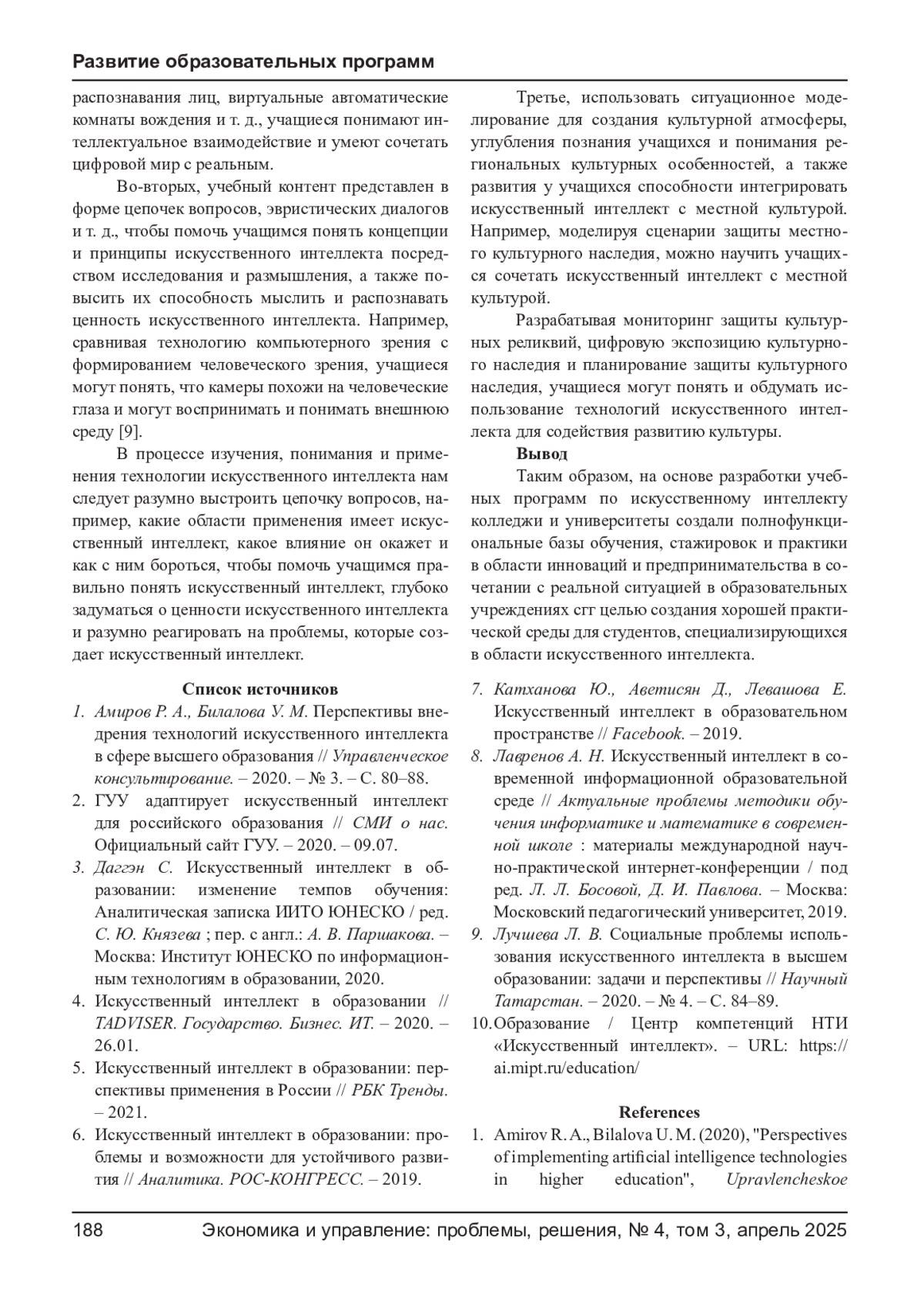 1. Амиров Р. А., Билалова У. М. Перспективы внедрения технологий искусственного интеллекта в сфере высшего образования // Управленческое консультирование. - 2020. - № 3. - С. 80-88. EDN: XKTQTC