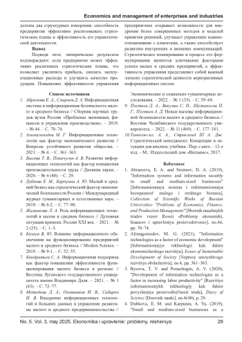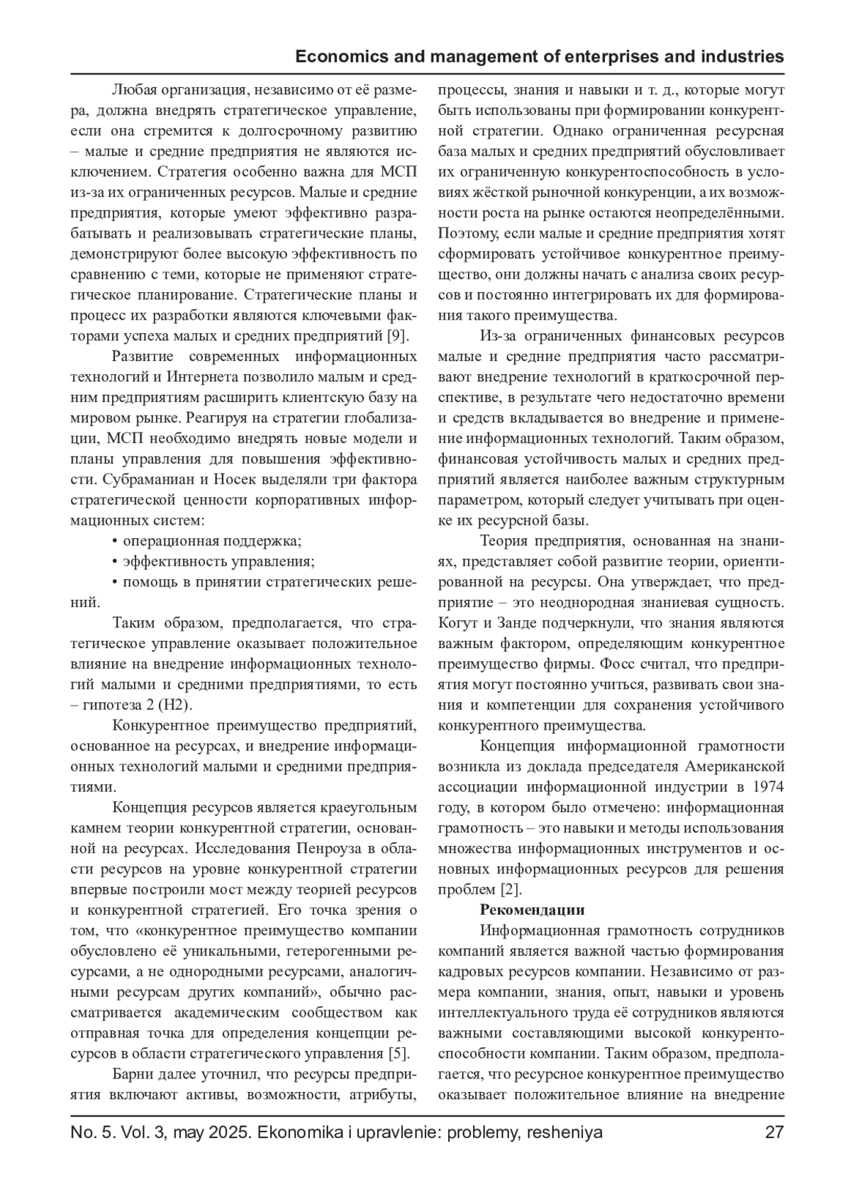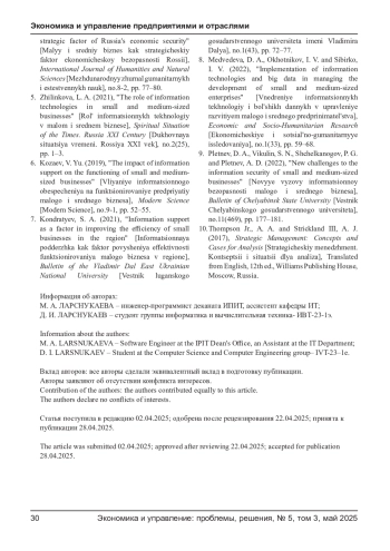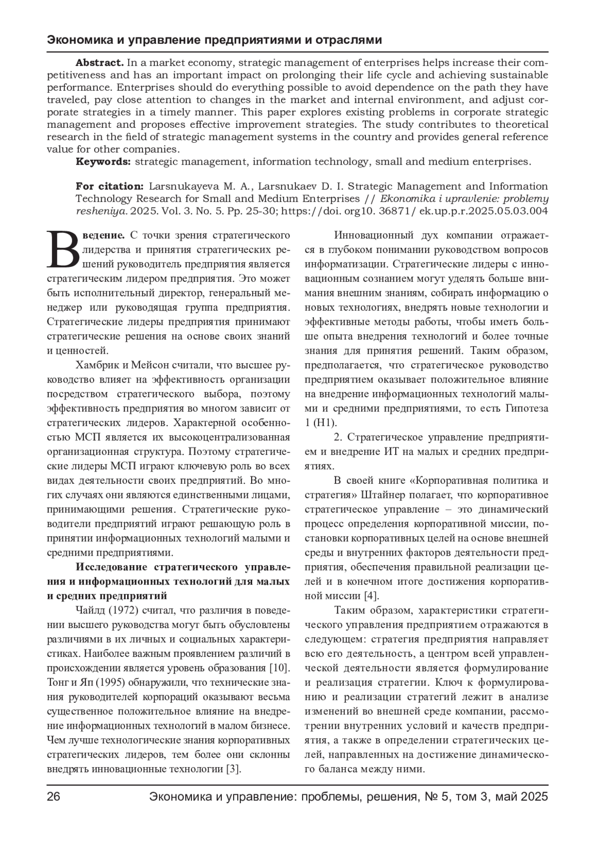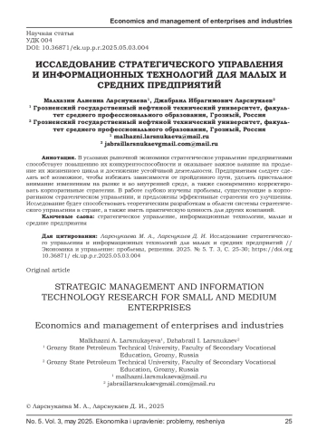 ЛАРСНУКАЕВА М. А., ЛАРСНУКАЕВ Д. И. ИССЛЕДОВАНИЕ СТРАТЕГИЧЕСКОГО УПРАВЛЕНИЯ И ИНФОРМАЦИОННЫХ ТЕХНОЛОГИЙ ДЛЯ МАЛЫХ И СРЕДНИХ ПРЕДПРИЯТИЙ // ЭКОНОМИКА И УПРАВЛЕНИЕ: ПРОБЛЕМЫ, РЕШЕНИЯ. 2025. ТОМ 3 № 5