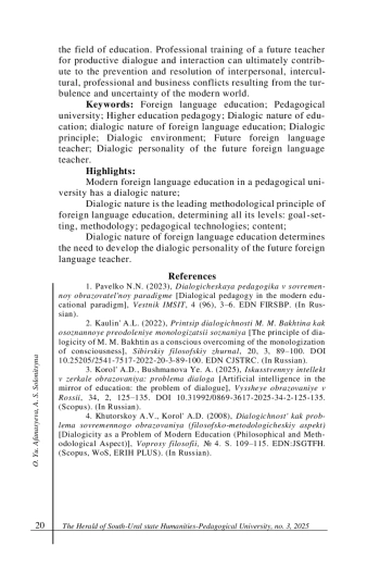 Введение. В настоящее время гуманитарное знание постоянно обращается к проблеме диалогичности, которая находит отражение в различных областях знания, а в последние годы - и в педагогических науках. Многие специалисты в области иноязычного образования утверждают, что диалогичность представляет собой ведущий методологический принцип, который призван детерминировать основные аспекты образовательного процесса в высшей школе: целеполагание, содержание, методико-технологическое обеспечение и т. д. Цель статьи - определить роль диалогичности в иноязычном образовании в педагогическом вузе при подготовке будущего учителя иностранного языка.