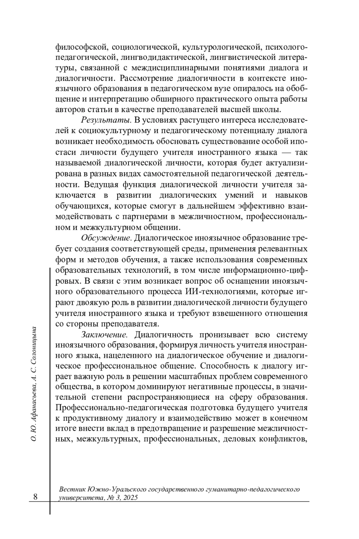 Обсуждение. Диалогическое иноязычное образование требует создания соответствующей среды, применения релевантных форм и методов обучения, а также использования современных образовательных технологий, в том числе информационно-цифровых. В связи с этим возникает вопрос об оснащении иноязычного образовательного процесса ИИ-технологиями, которые играют двоякую роль в развитии диалогической личности будущего учителя иностранного языка и требуют взвешенного отношения со стороны преподавателя.