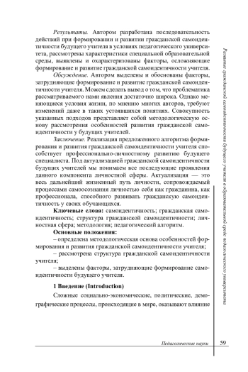 Заключение. Реализация предложенного алгоритма формирования и развития гражданской самоидентичности учителя способствует профессионально-личностному развитию будущего специалиста. Под актуализацией гражданской самоидентичности будущих учителей мы понимаем все последующие проявления данного компонента личностной сферы. Актуализация - это весь дальнейший жизненный путь личности, сопровождаемый процессами самоосознания личностью себя как гражданина, как профессионала, способного развивать гражданскую самоидентичность у своих обучающихся. Основные положения: - определена методологическая основа особенностей формирования и развития гражданской самоидентичности учителя; - рассмотрена структура гражданской самоидентичности учителя; - выделены факторы, затрудняющие формирование самоидентичности будущего учителя.