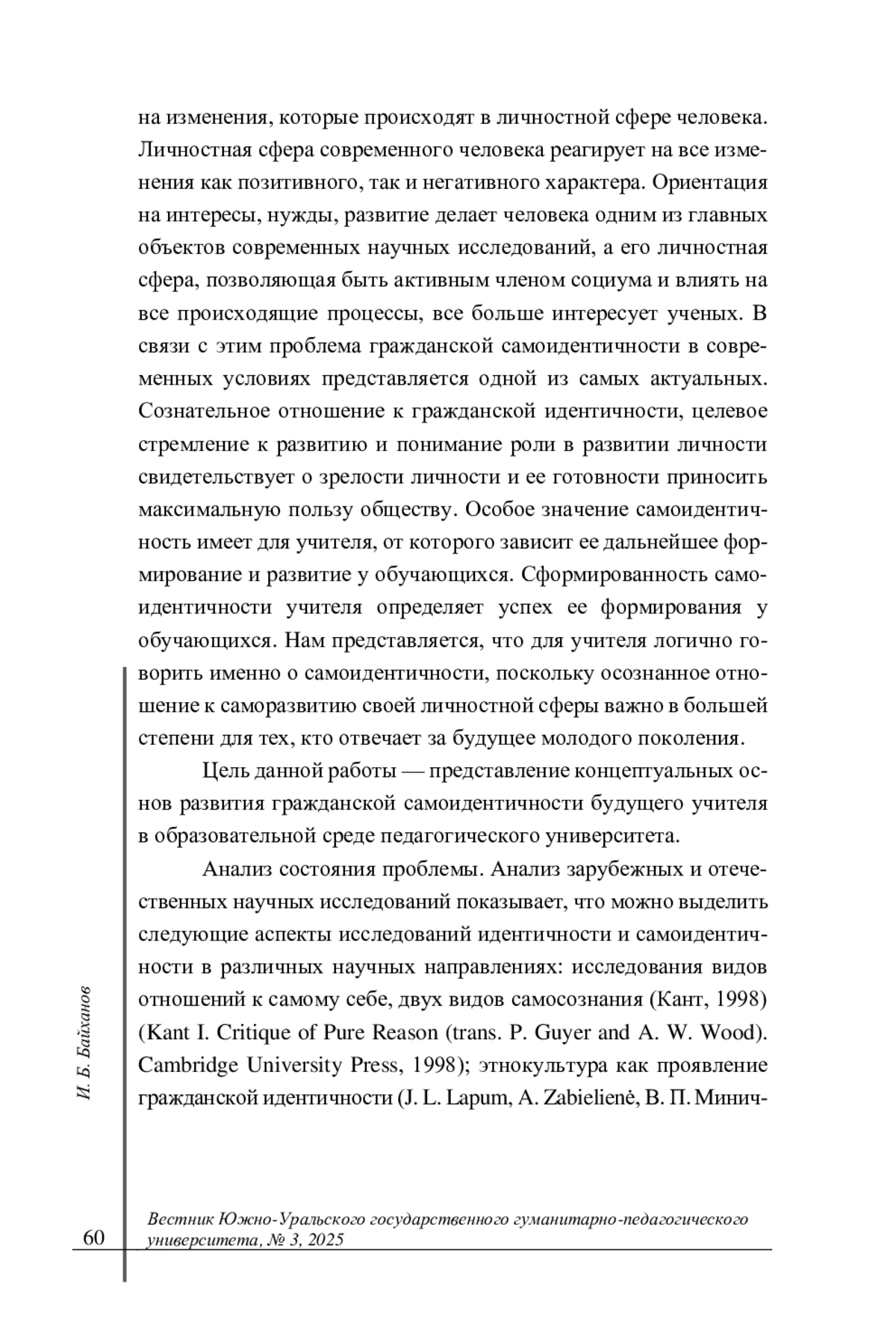 БАЙХАНОВ И. Б. РАЗВИТИЕ ГРАЖДАНСКОЙ САМОИДЕНТИЧНОСТИ БУДУЩЕГО УЧИТЕЛЯ В ОБРАЗОВАТЕЛЬНОЙ СРЕДЕ ПЕДАГОГИЧЕСКОГО УНИВЕРСИТЕТА // ВЕСТНИК ЮЖНО-УРАЛЬСКОГО ГОСУДАРСТВЕННОГО ГУМАНИТАРНО-ПЕДАГОГИЧЕСКОГО УНИВЕРСИТЕТА. 2025. № 3 (187)