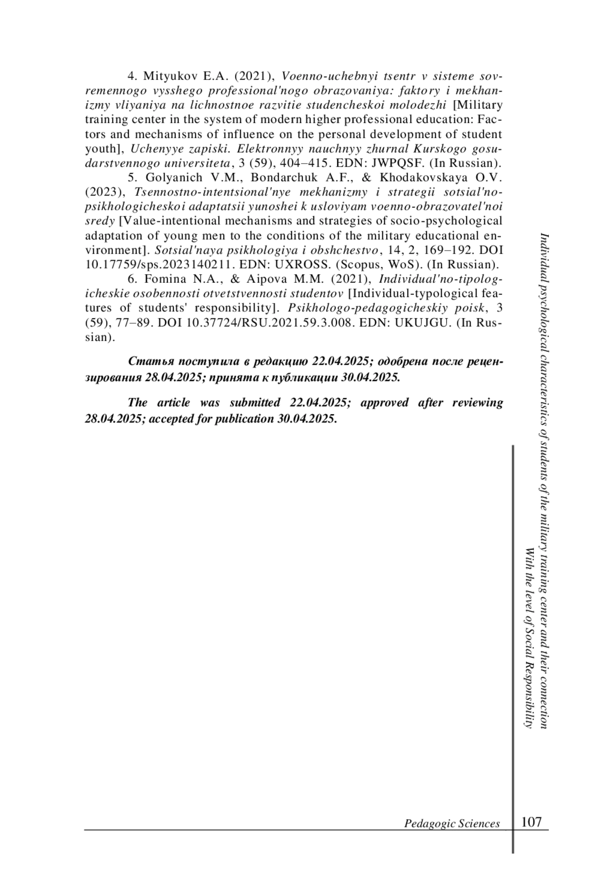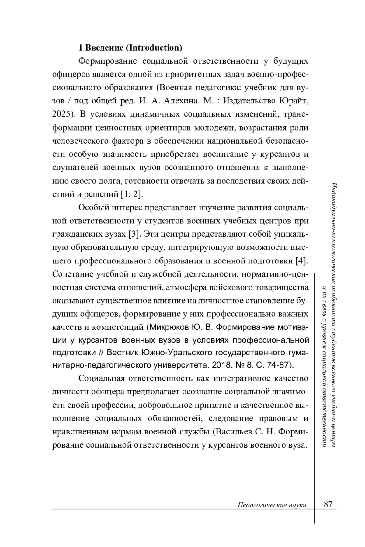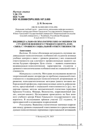 Статья: ИНДИВИДУАЛЬНО-ПСИХОЛОГИЧЕСКИЕ ОСОБЕННОСТИ СТУДЕНТОВ ВОЕННОГО УЧЕБНОГО ЦЕНТРА И ИХ СВЯЗЬ С УРОВНЕМ СОЦИАЛЬНОЙ ОТВЕТСТВЕННОСТИ (2025)